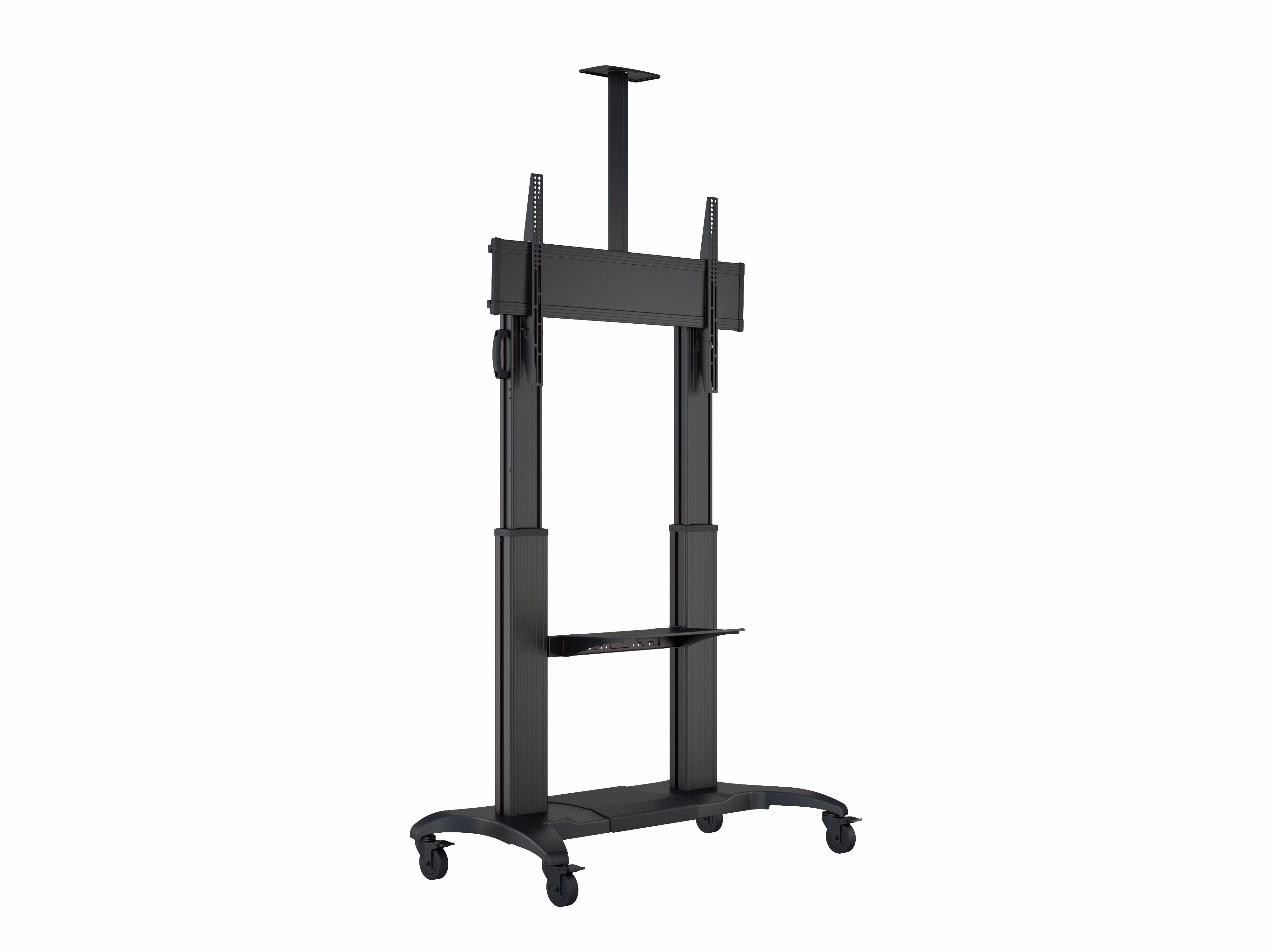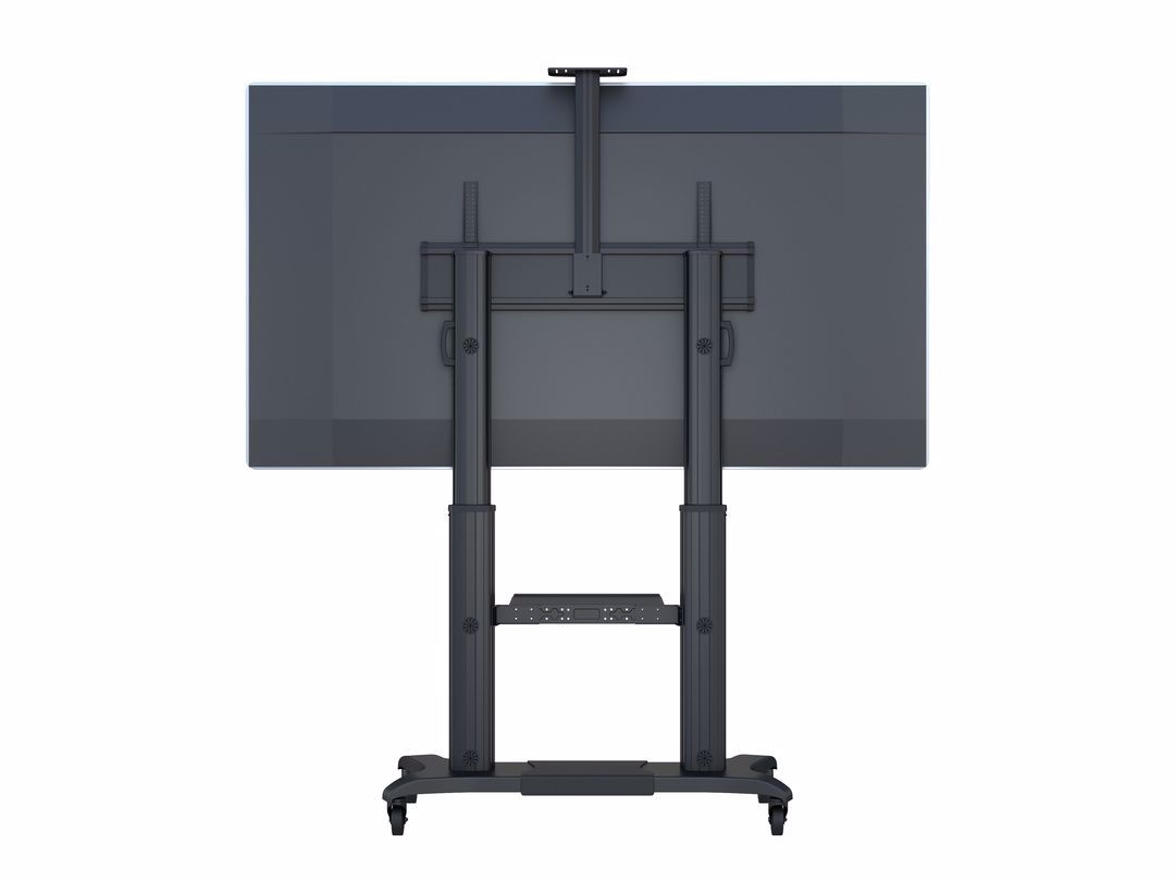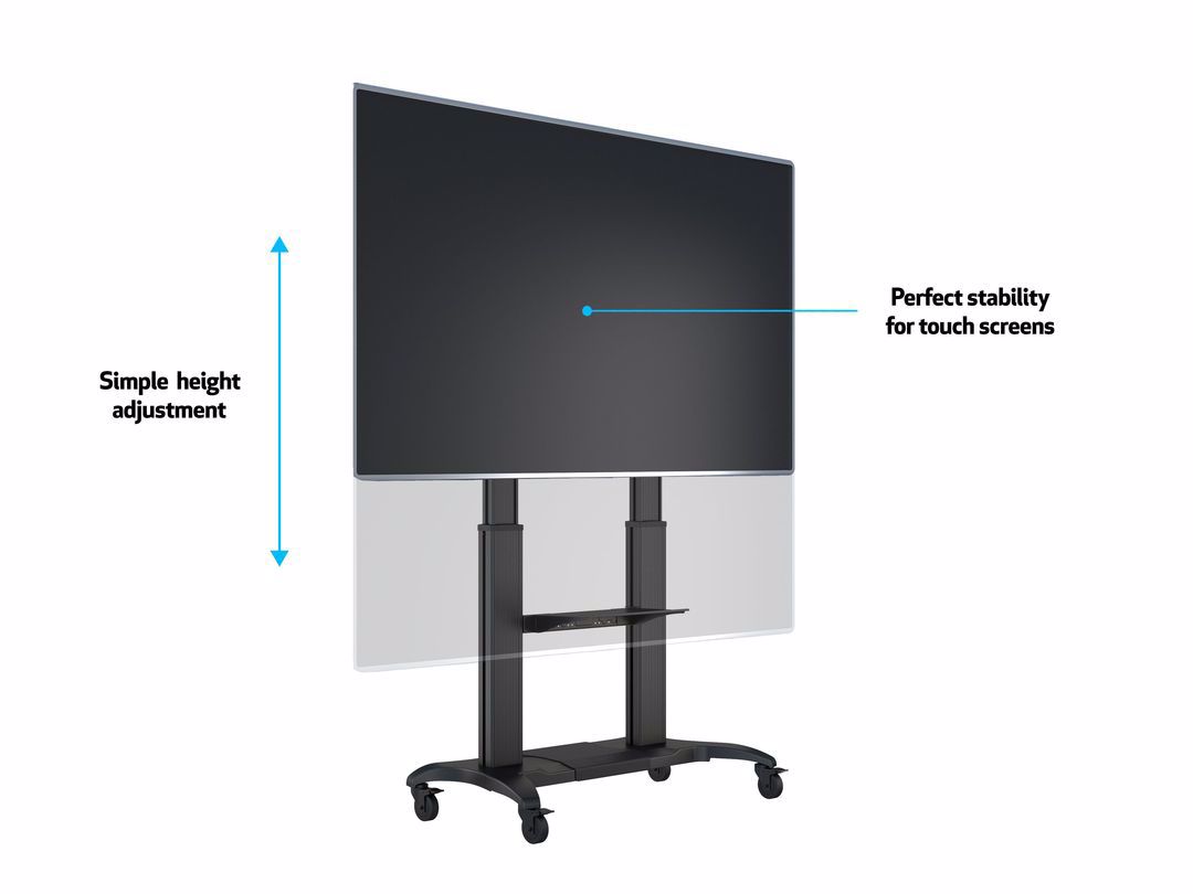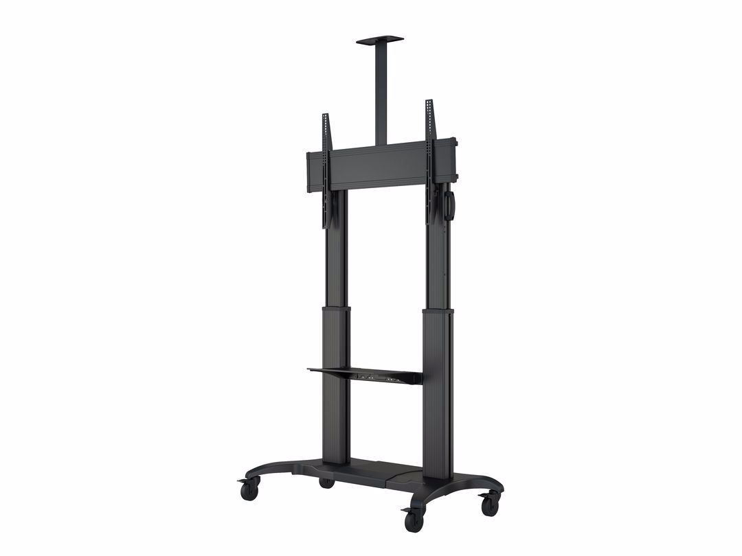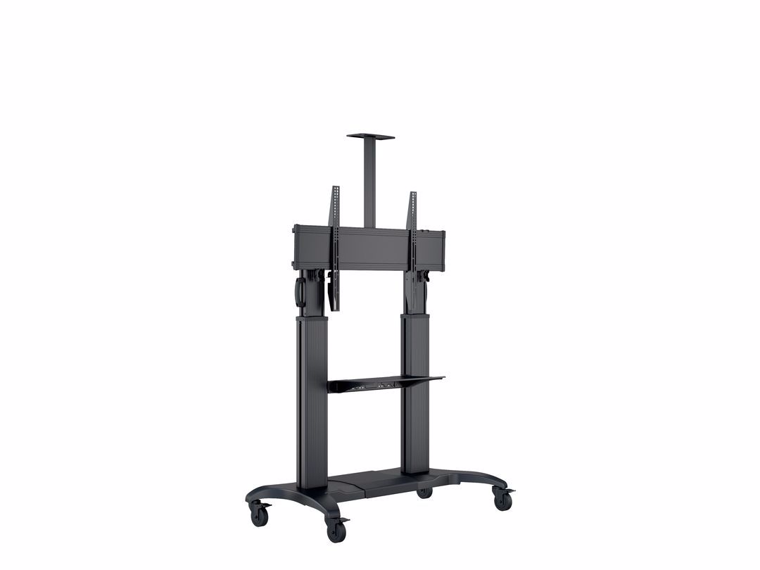 Now you can mount flat panel screens up to 100" displays on a movable Floorstand. With its black, textured powder coat finish it helps hide finger prints or dust. This Floorstand features an easy to position display height adjustment function that is unique. This innovative design with a built in stopper mechanism into the two columns creates a tool free and effortless TV height adjustment. This function reduces time consuming adjustments of height that is used on other floorstands. Now you in seconds can match your audience wheter its sitting or standing up. For fast installation the base comes pre-assembled. VESA specifications ranges from 200x200 up to 1000x600 VESA display mounting pattern, and sturdy swivel casters – two of which are lockable to keep the Floorstand in it´s place. The integrated cable management system that helps keep your cables organized and out of the way. During its introduction this versatile Floorstand also comes with accessories such as the component shelf and camerashelf included as standard.