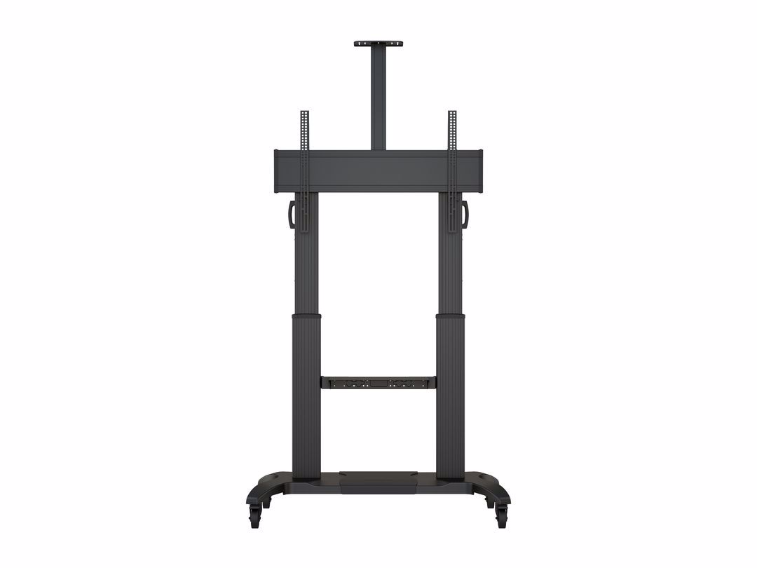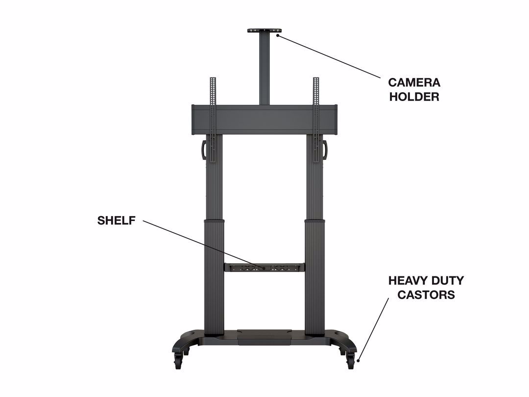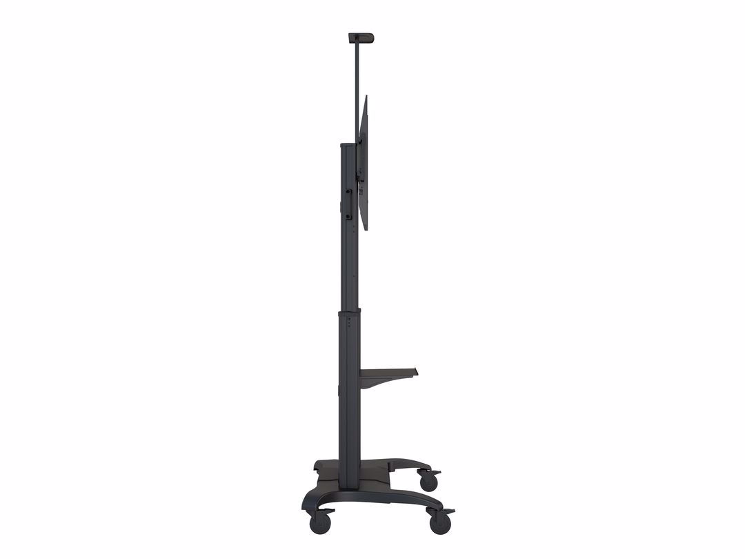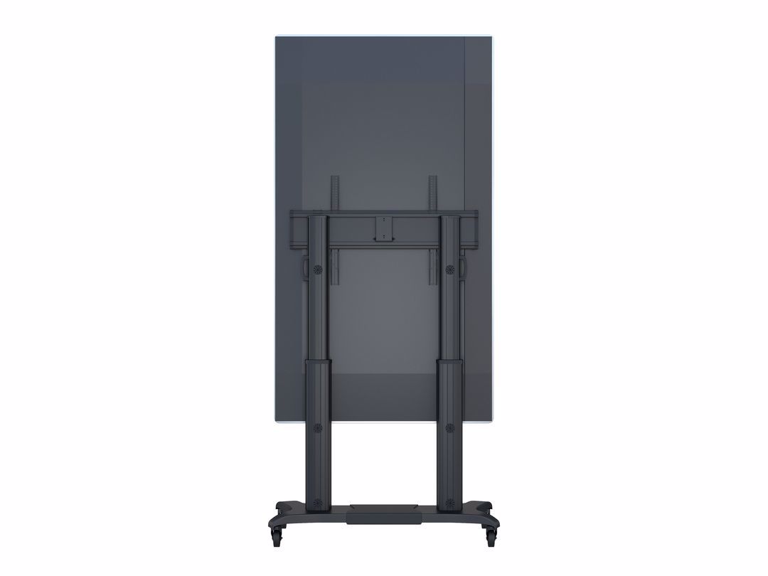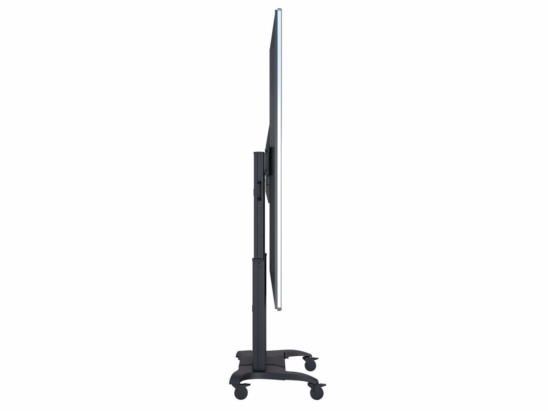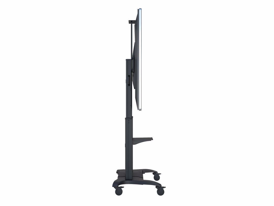 Now you can mount flat panel screens up to 100" displays on a movable Floorstand. With its black, textured powder coat finish it helps hide finger prints or dust. This Floorstand features an easy to position display height adjustment function that is unique. This innovative design with a built in stopper mechanism into the two columns creates a tool free and effortless TV height adjustment. This function reduces time consuming adjustments of height that is used on other floorstands. Now you in seconds can match your audience wheter its sitting or standing up. For fast installation the base comes pre-assembled. VESA specifications ranges from 200x200 up to 1000x600 VESA display mounting pattern, and sturdy swivel casters – two of which are lockable to keep the Floorstand in it´s place. The integrated cable management system that helps keep your cables organized and out of the way. During its introduction this versatile Floorstand also comes with accessories such as the component shelf and camerashelf included as standard.