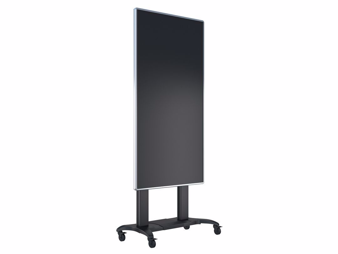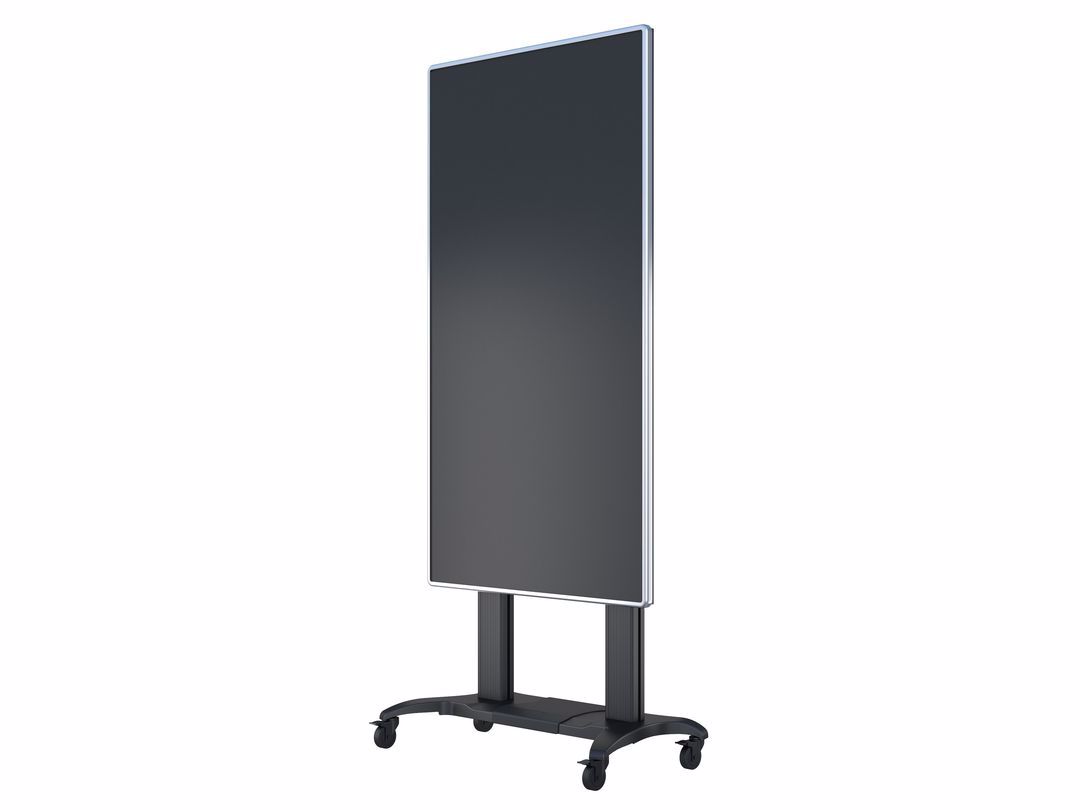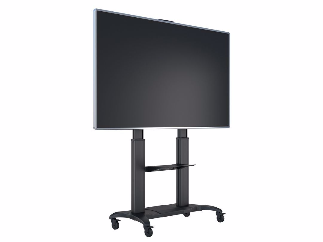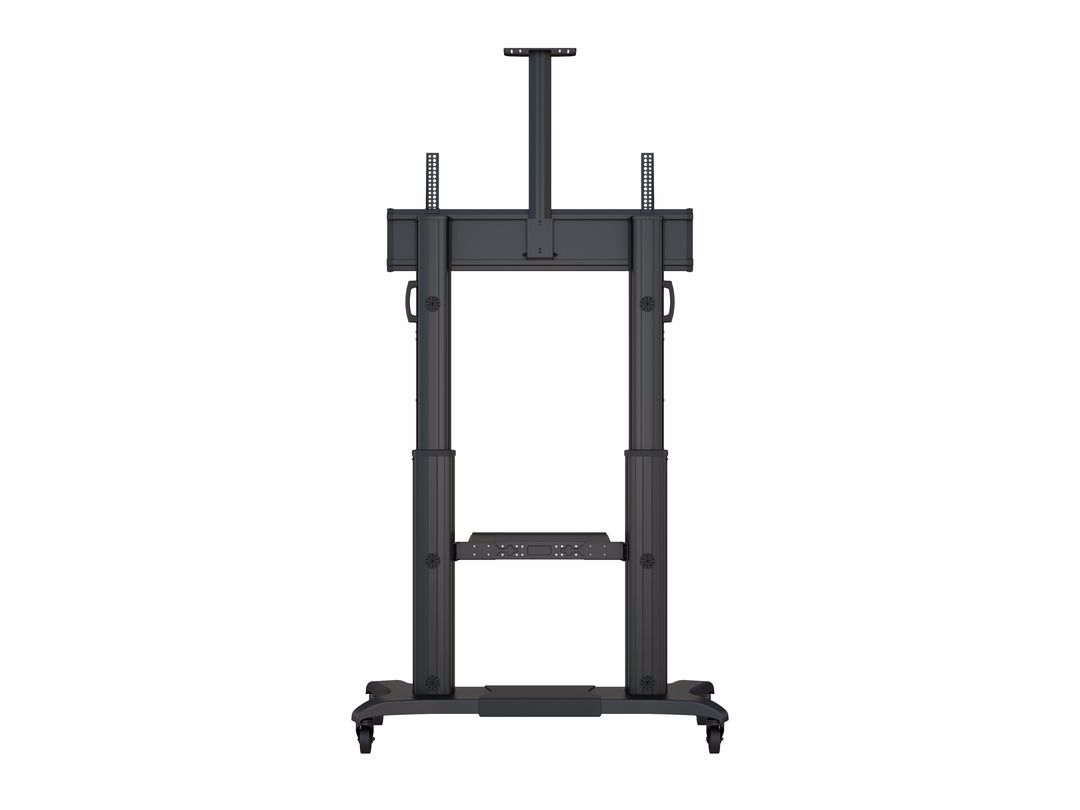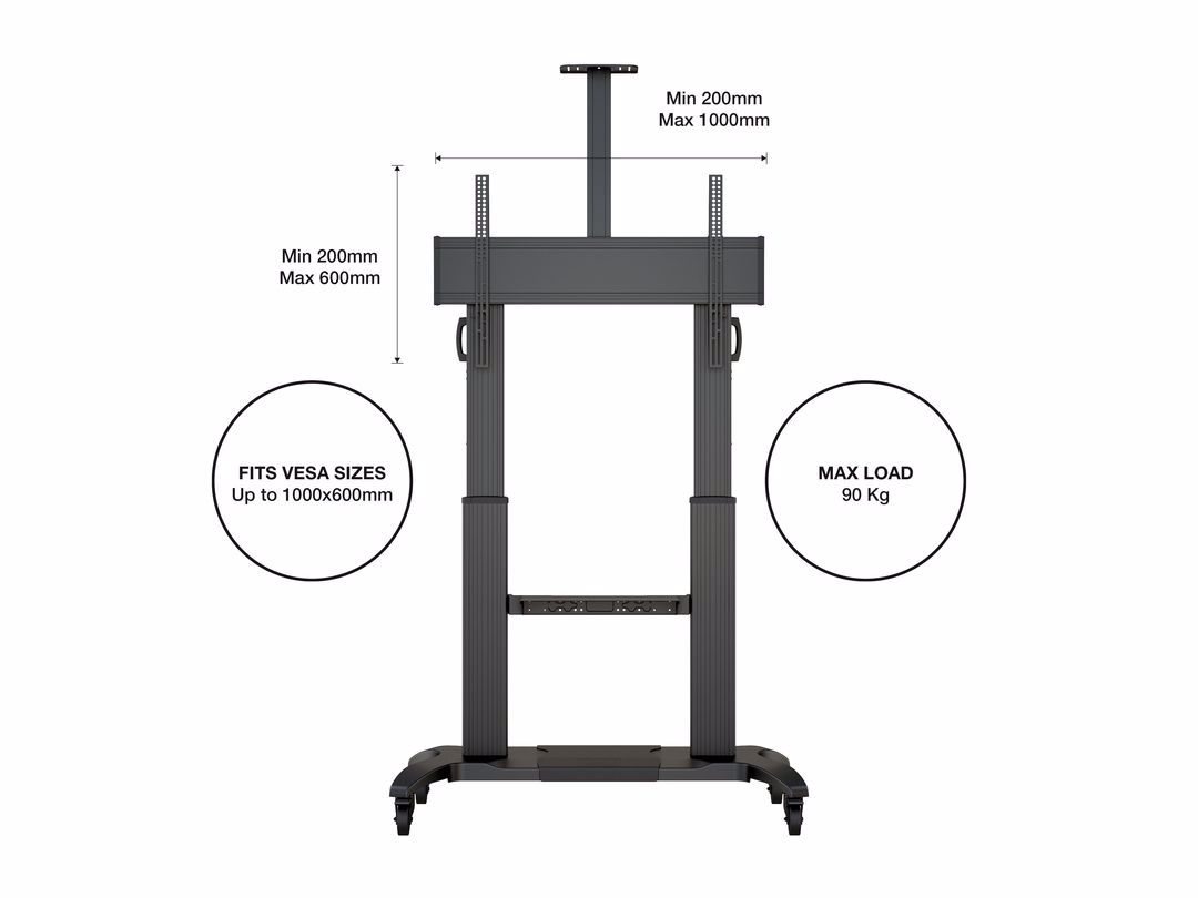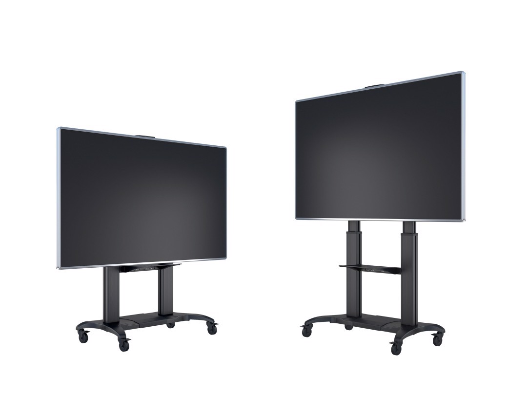 Now you can mount flat panel screens up to 100" displays on a movable Floorstand. With its black, textured powder coat finish it helps hide finger prints or dust. This Floorstand features an easy to position display height adjustment function that is unique. This innovative design with a built in stopper mechanism into the two columns creates a tool free and effortless TV height adjustment. This function reduces time consuming adjustments of height that is used on other floorstands. Now you in seconds can match your audience wheter its sitting or standing up. For fast installation the base comes pre-assembled. VESA specifications ranges from 200x200 up to 1000x600 VESA display mounting pattern, and sturdy swivel casters – two of which are lockable to keep the Floorstand in it´s place. The integrated cable management system that helps keep your cables organized and out of the way. During its introduction this versatile Floorstand also comes with accessories such as the component shelf and camerashelf included as standard.