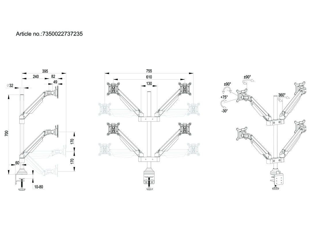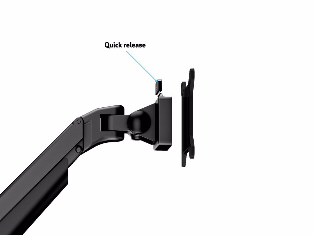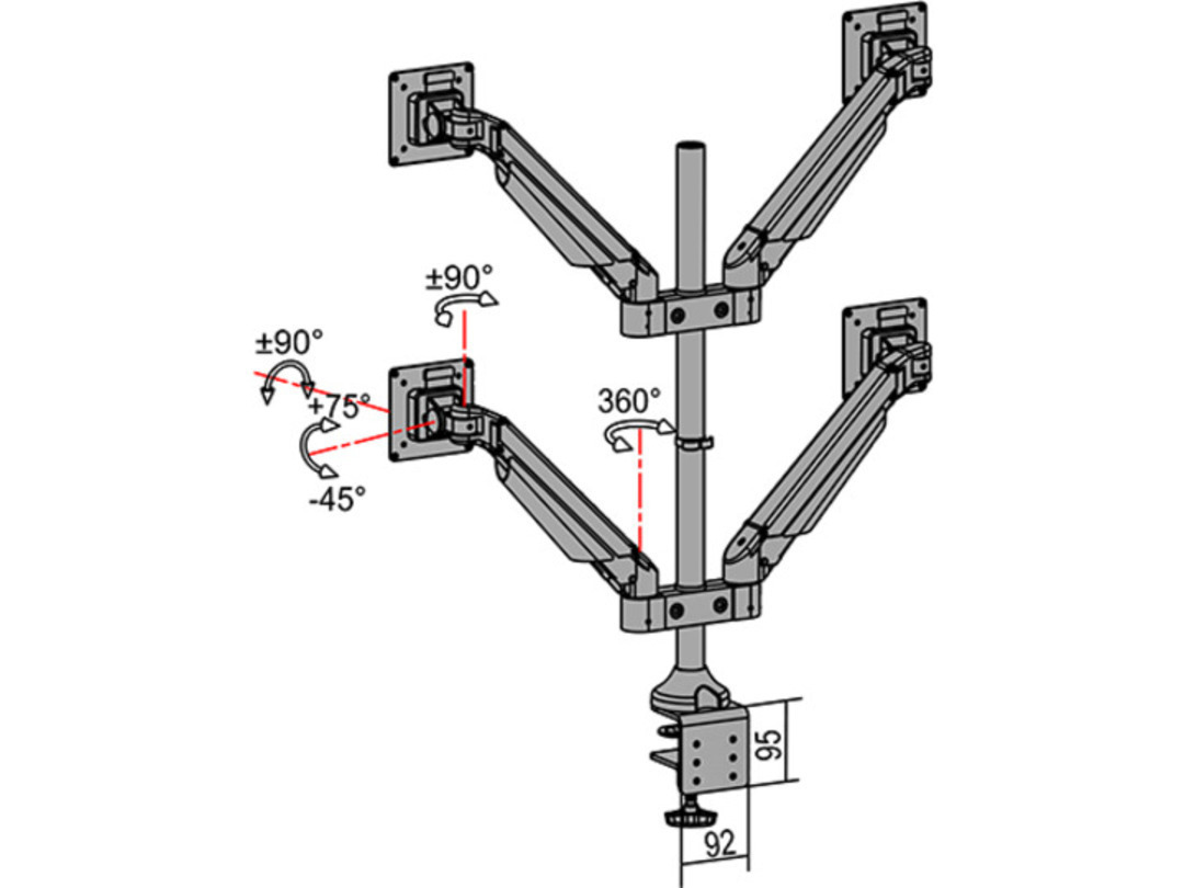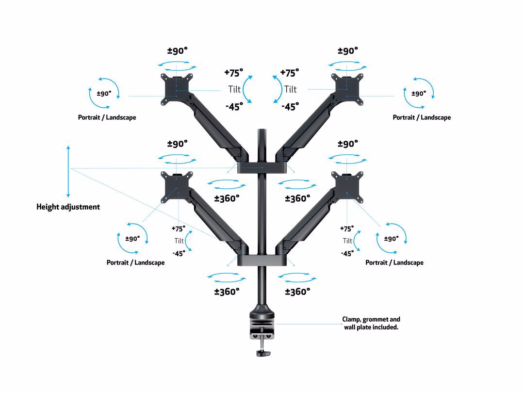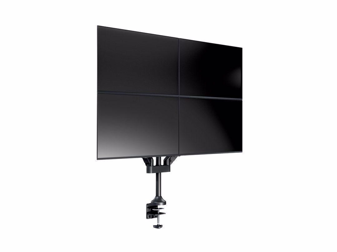 The M Vesa Gas Lift Arm Quad holds to your standard workdesk (max 50mm), or assemble it using a workdesk thru hole technique.
