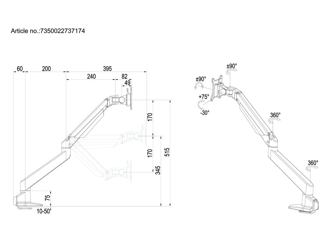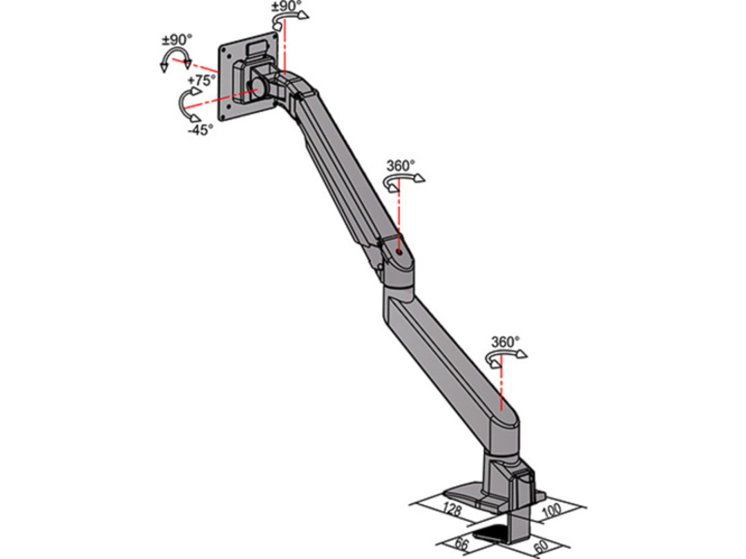 The M VESA Gas Lift Arm is made out of a durable aluminum construction and uses a gas driven suspension technique. This makes the screen "float" and it can then be moved with near zero effort. Sleek and streamlined, the M VESA Gas Lift Arm Single frees up space and allows positioning of your display for greater productivity. The unique counterbalance gas technology provides smooth adjustment in any direction. Easy move the screen from landscape to portrait position or move the screen close to the desk, high up, matching almost any wanted working position imaginable.