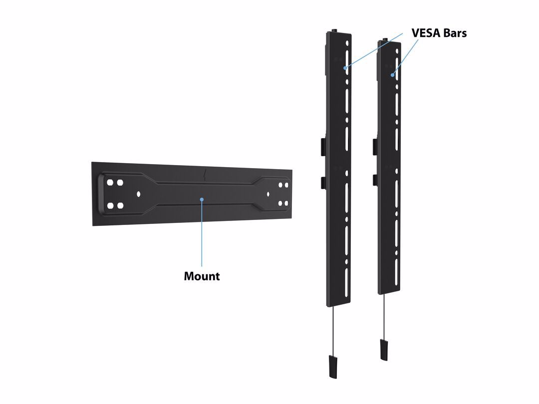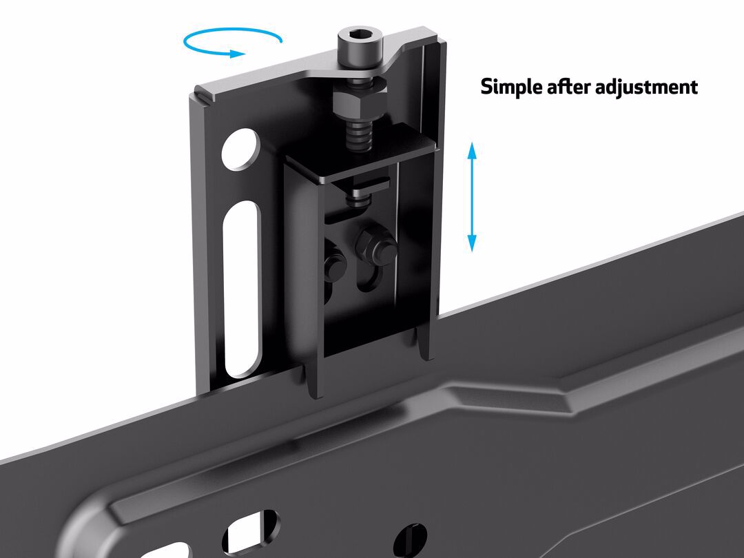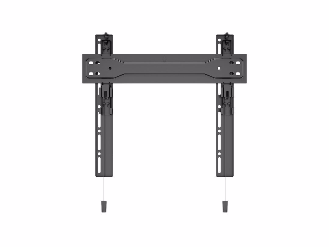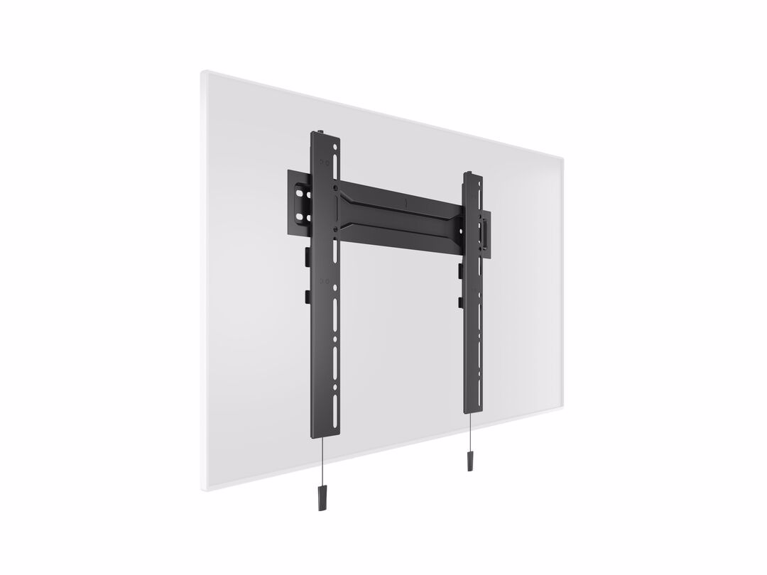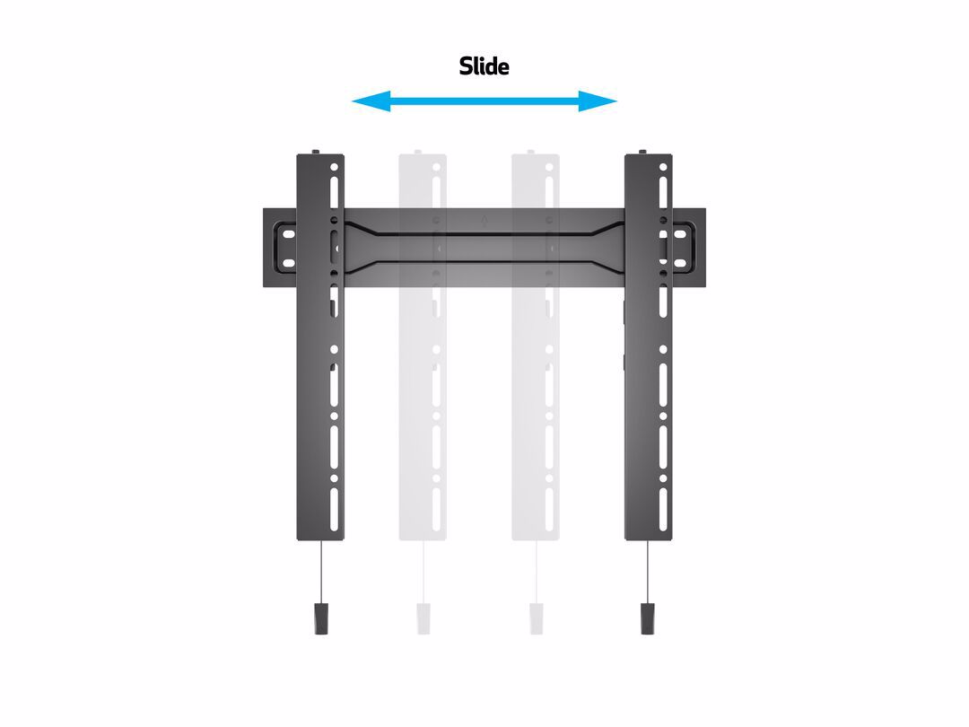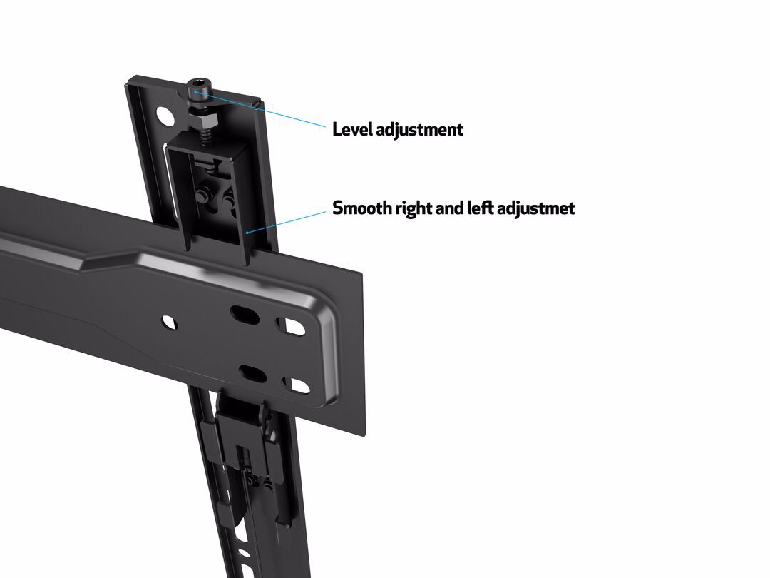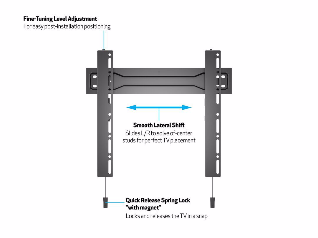 Several steps ahead. The M VESA Wallmount Super Slim Fixed 400 MAX series offers versatile installation features and mounting options. Horizontal and vertical adjustment abilities allow for post installation leveling and lateral shifting (move the screen from side to side after it is in place) making it easier than ever to find the perfect TV position. Lock the tilt angle at installation to prevent tampering or moving. The slim wall plate design offers good wall access, increasing the electrical and cable management options. The wall mount was made to be installed by a single person with simple brackets that hook onto the wall plate for an overall quick, simple, and secure installation.