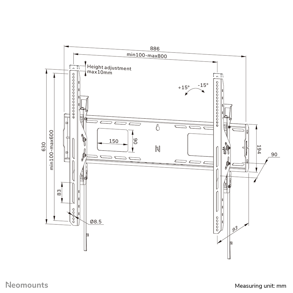 The Neomounts WL35-750BL18 LEVEL is the ultimate tiltable solution for securely mounting an interactive or heavy weight display up to 98" with a maximum capacity of 125 kg. The toolless tilt adjustment (+15°/-15°) allows you to create the optimum viewing angle. This heavy-duty wall mount features a sturdy high profile wall plate and is engineered for stability and precision, ensuring your screen is securely mounted even on uneven surfaces. The mount features individual adjustable brackets (10 mm) for securely adjusting the display height or levelling it.