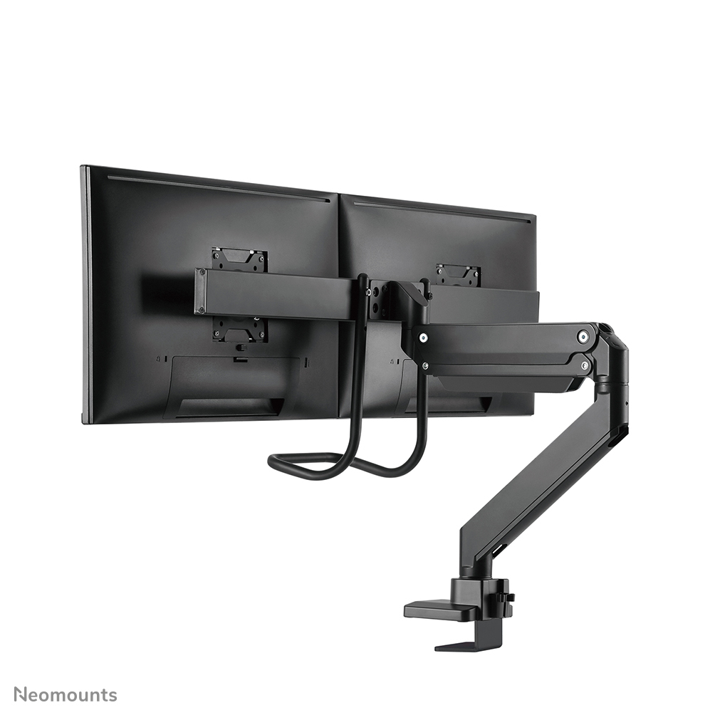 The Neomounts NM-D775DXBLACK is a tilt-, swivel and rotatable desk mount with crossbar and handle for 2 flat screens up to 32". This mount is a great choice for space saving placement on desks using a desk clamp or grommet mount.