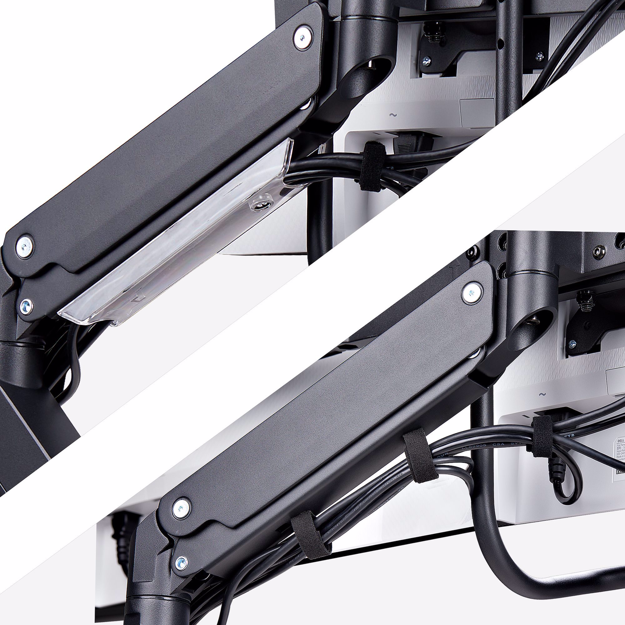 The spring arm enables toolless height adjustment of up to 13in (330mm) with effortless one-touch motion. The maximum arm extension is 24.8in (630mm), and the minimum arm extension is 4in (104mm). The weight capacity is 13.2lb (6kg) per VESA mount.