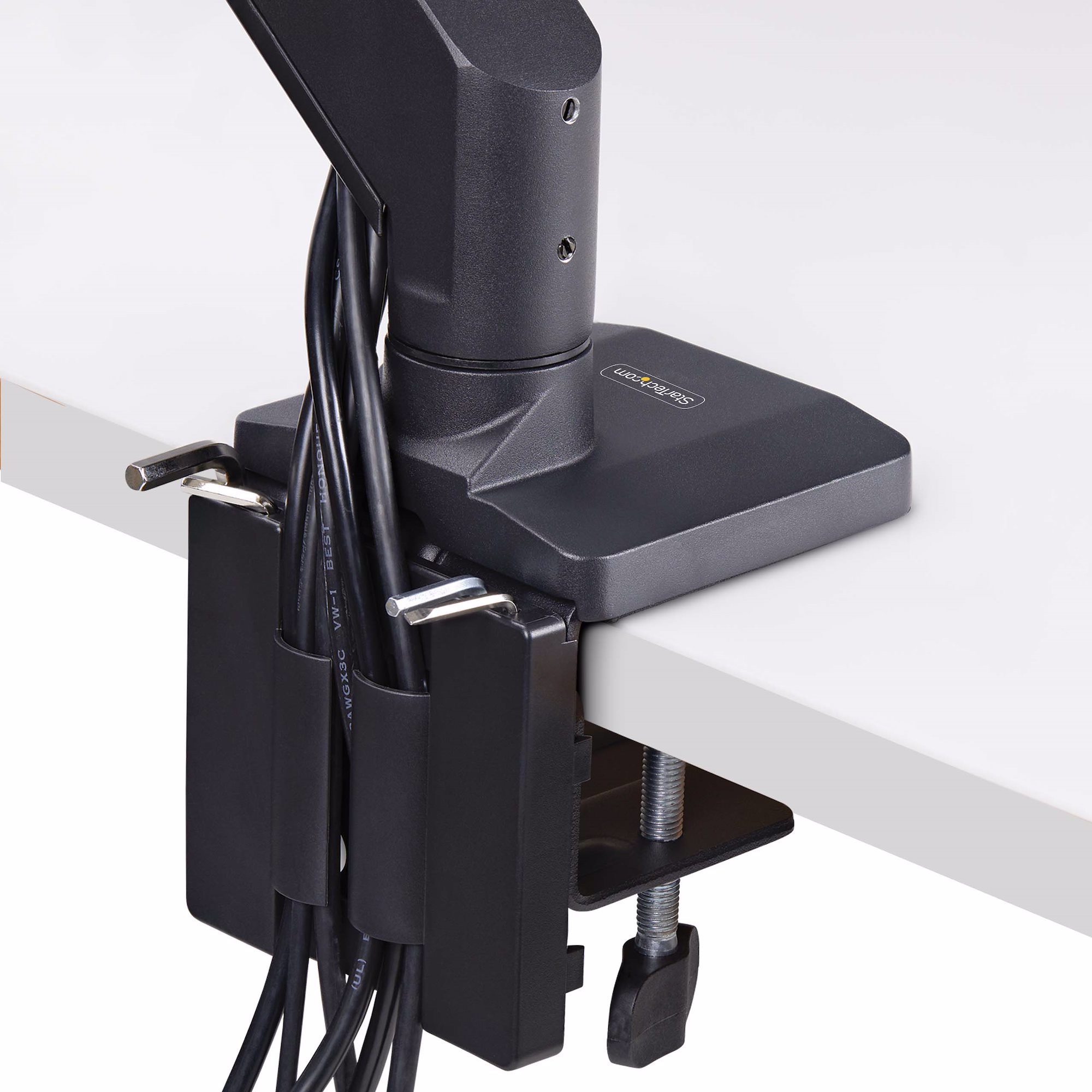 To maintain an organized workspace, the adjustable arm features a cable management channel along the underside to keep cables out of sight, reducing clutter and contributing to a tidy setup. A cable clip at the base maintains an organized workspace.