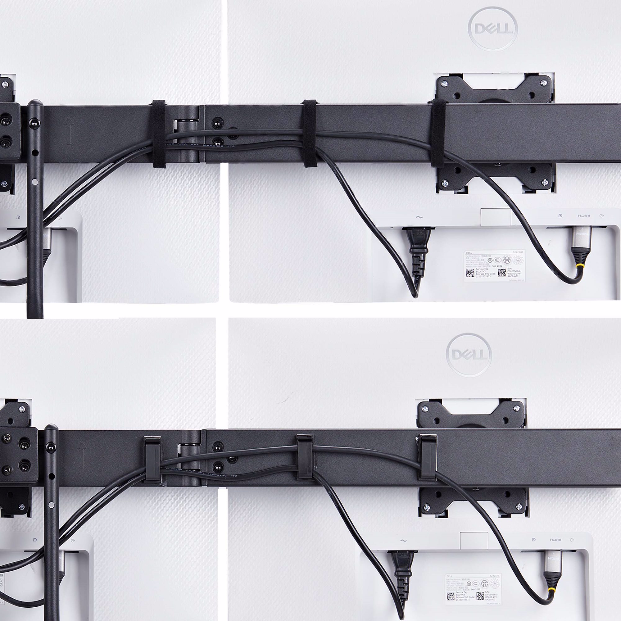 The monitor crossbar allows toolless adjustments of +/-15° horizontal swivel of the outer displays. The monitors' VESA mounts enable +/-10° horizontal swivel, +5/-15° tilt, and 360° screen rotation for portrait or landscape orientations.