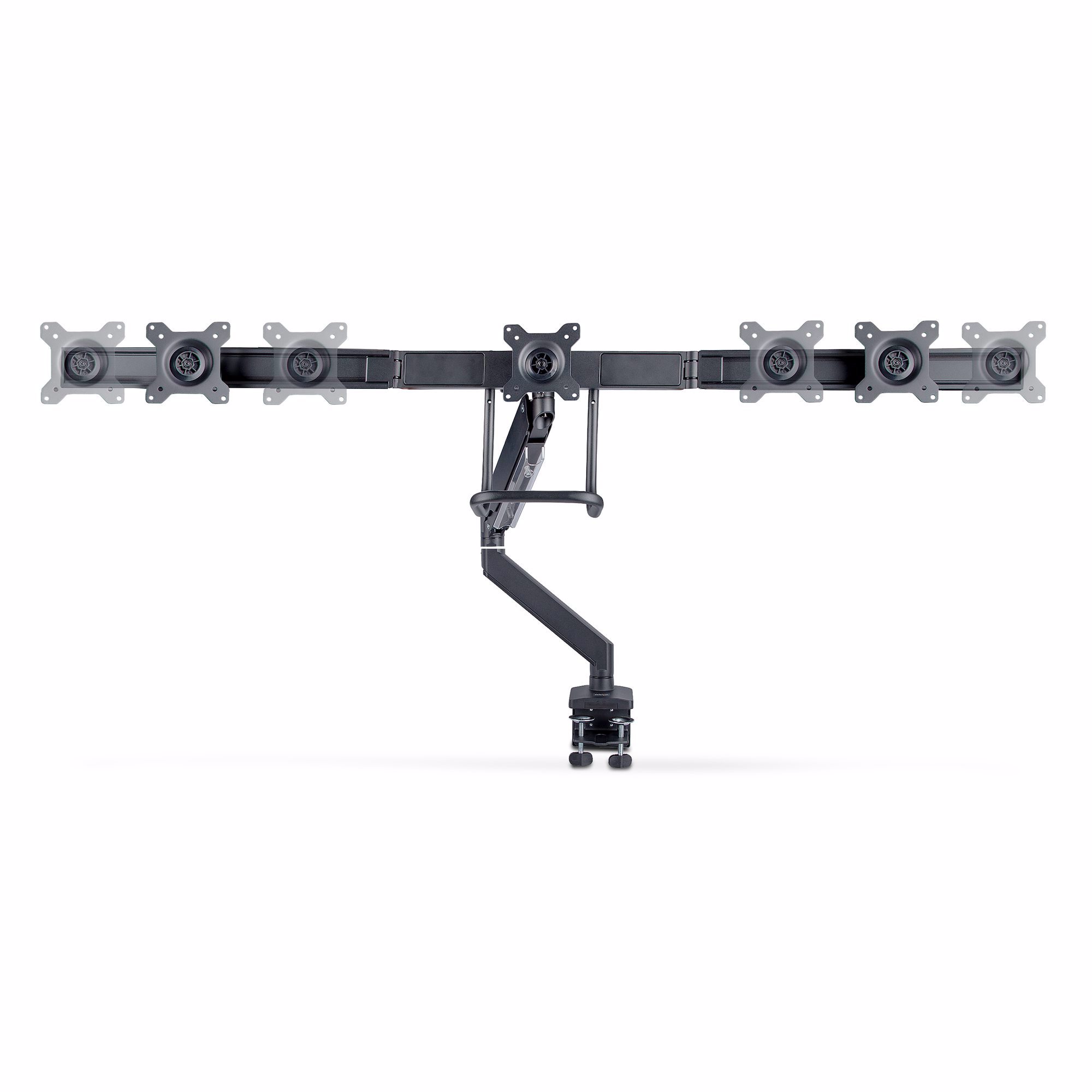 This triple monitor mount features micro height adjustment screws on the VESA plate that enable perfect alignment of all three monitors. This is ideal for bezel-less or slim bezel displays, helping to create a more extensive and seamless viewing area. The outer displays' VESA mounts slide along the crossbar, allowing further adjustments.
