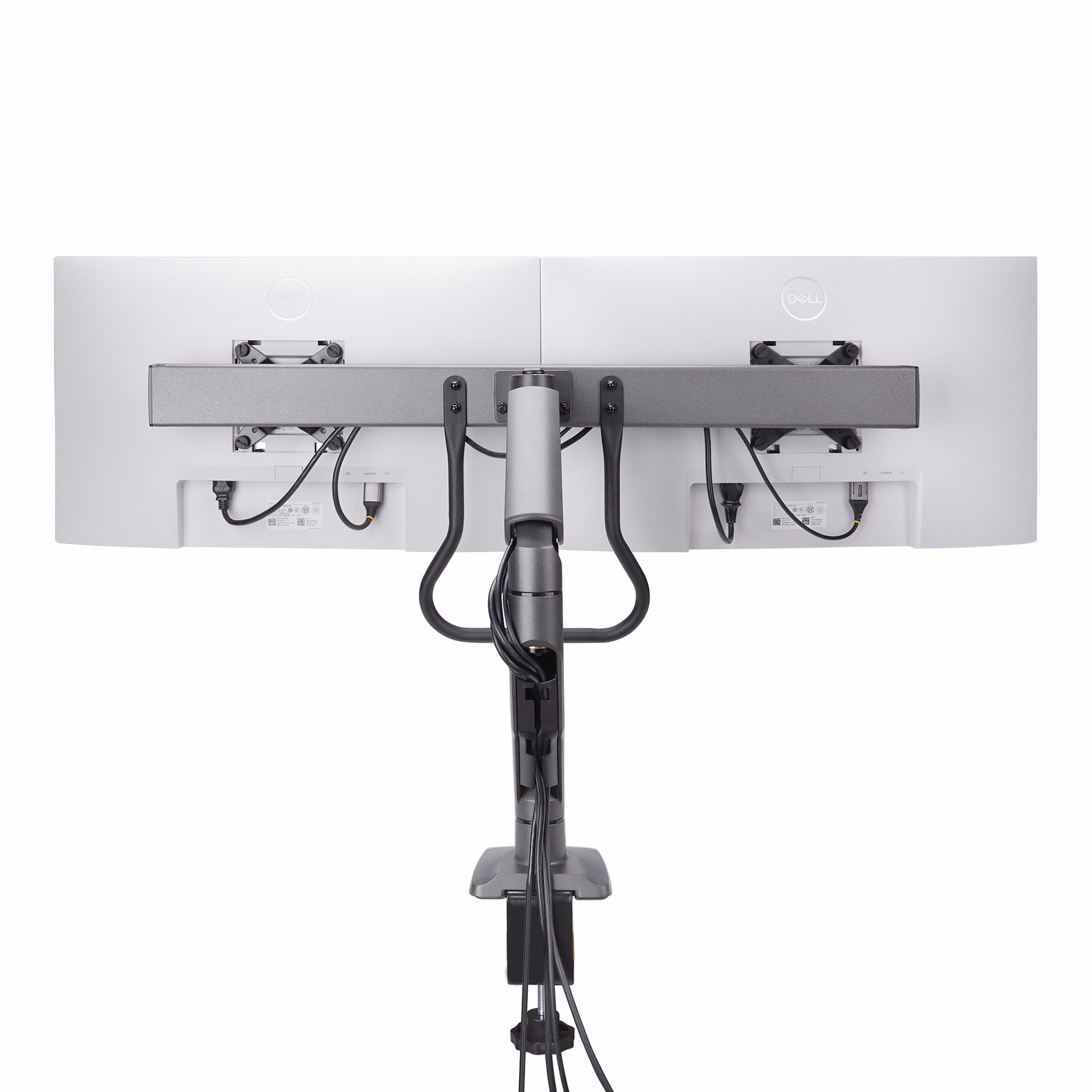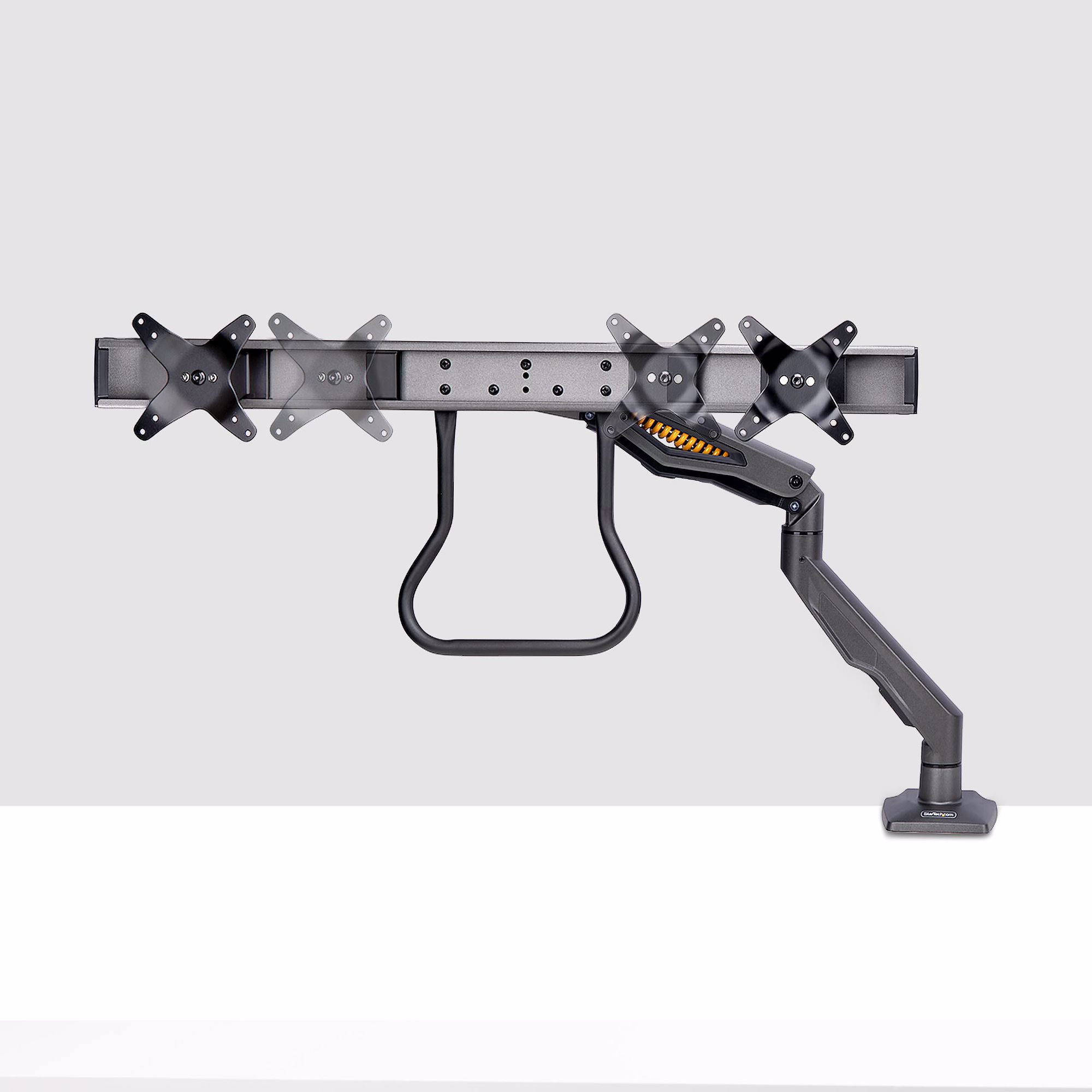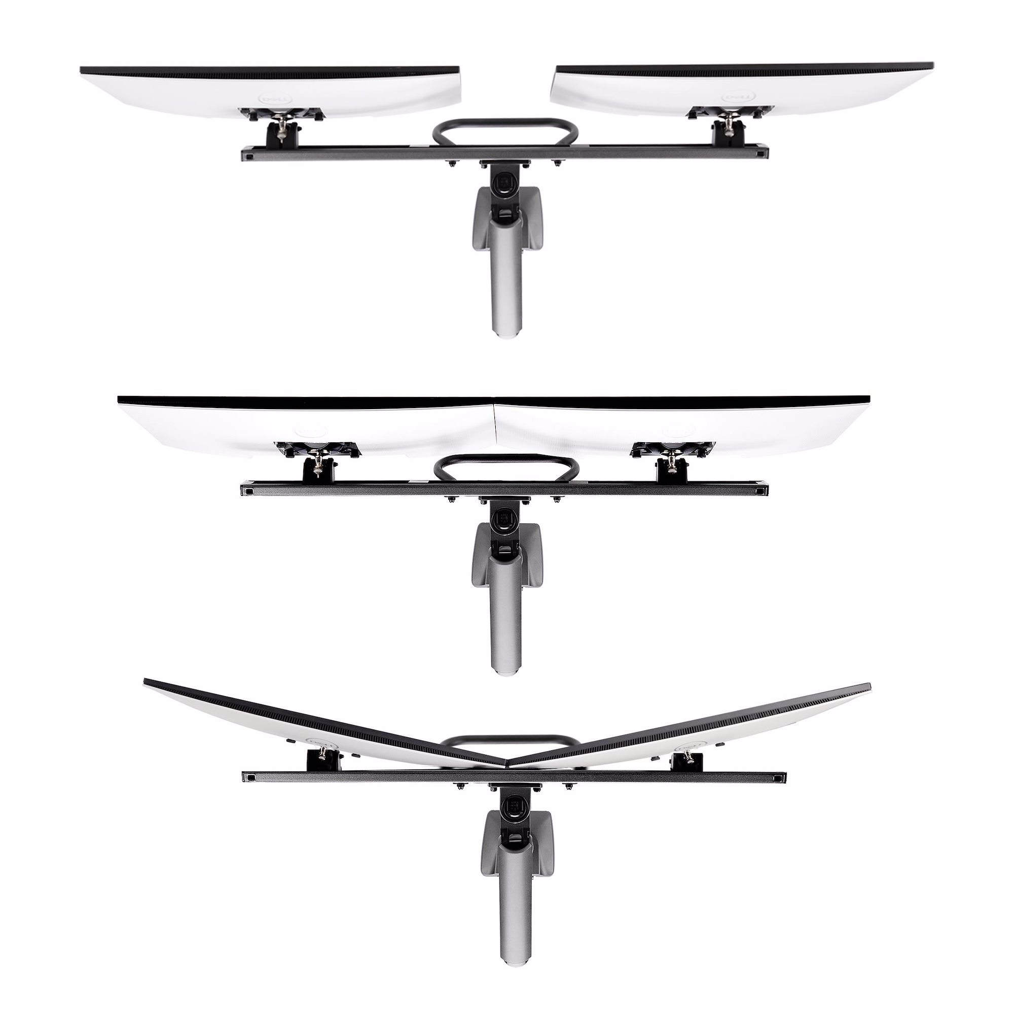 This monitor mount is ideal for bezel-less or slim bezel displays, creating a more extensive and seamless viewing experience that enhances multitasking and productivity. The VESA mounts can slide along the crossbar, allowing for further adjustments.
