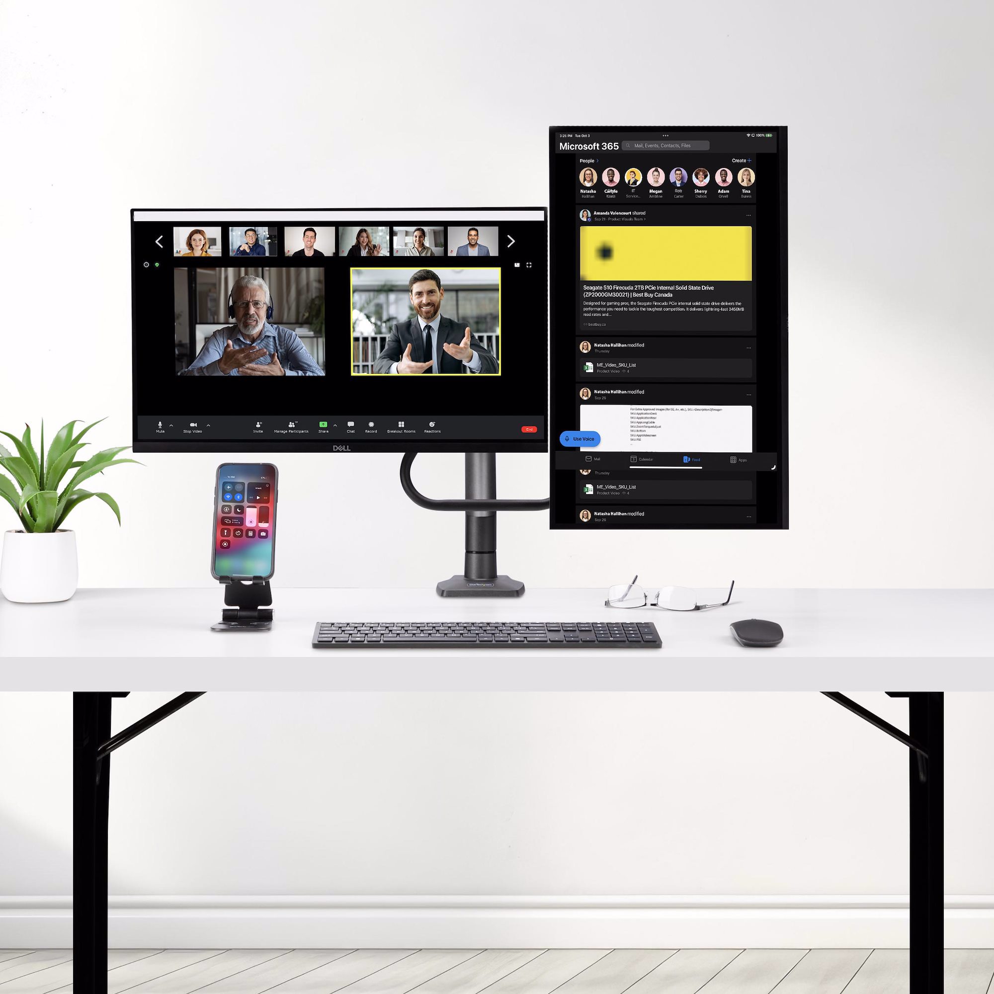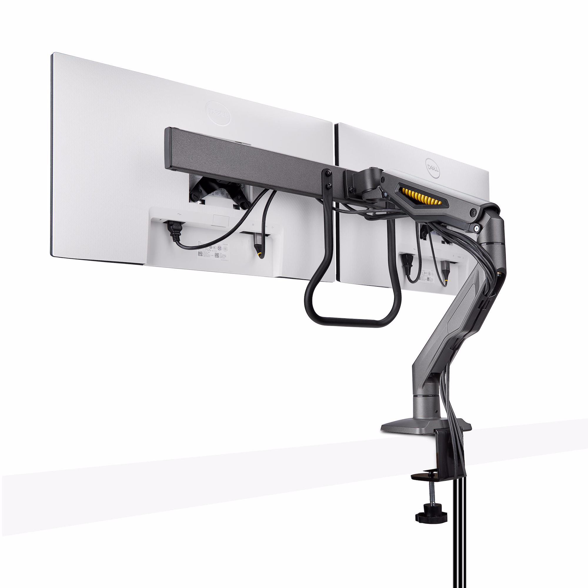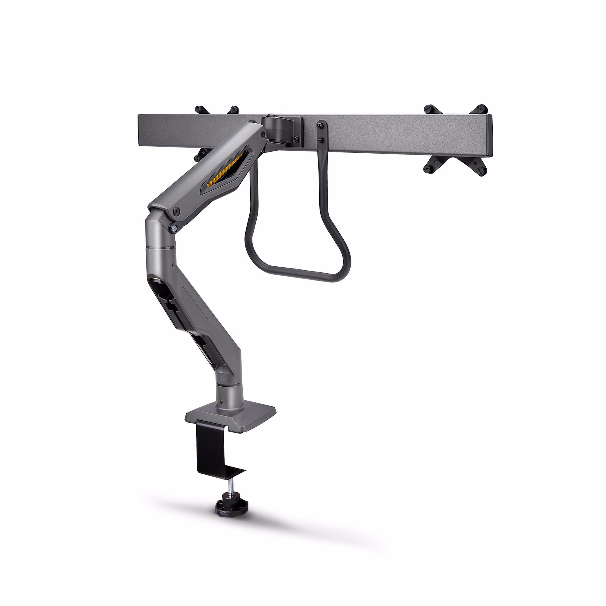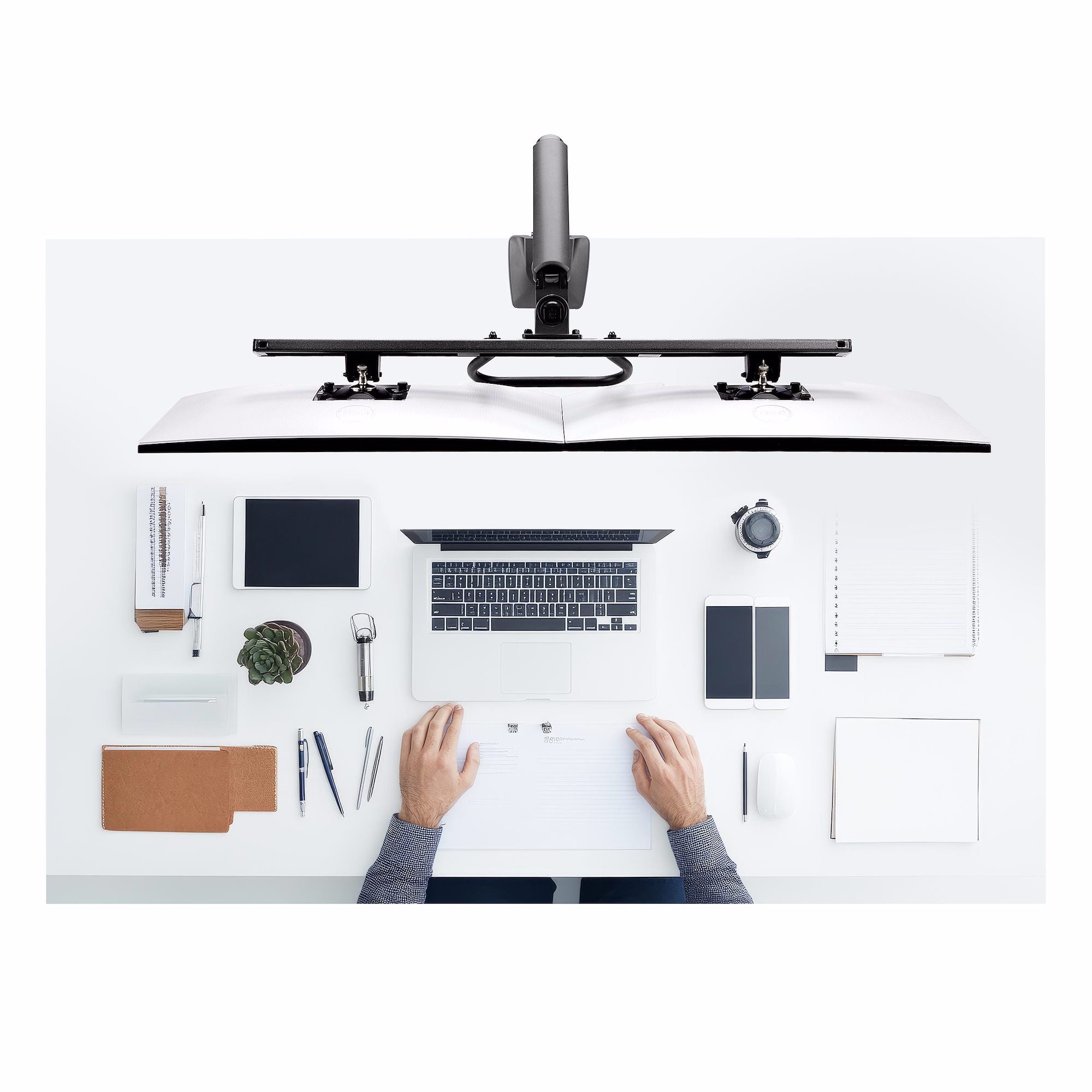 This crossbar monitor desk mount is designed to support up to two 27-inch displays, creating an ergonomic multi-monitor setup that provides an extensive viewing area for productivity. The built-in handle enables moving all monitors simultaneously, while the spring-assisted arm enables multiple adjustments to suit different ergonomic needs.