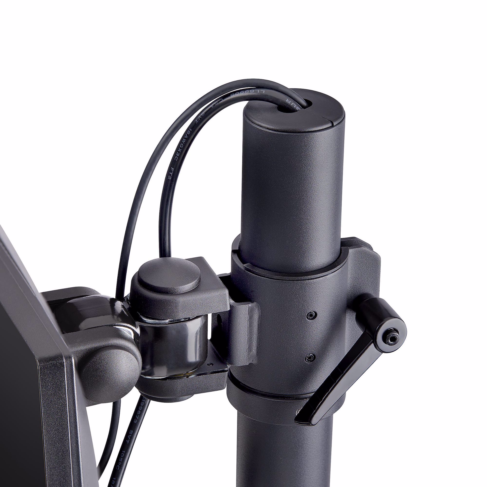 The double monitor mount features concealed cable management running the cables inside the pole for an organized and clutter-free setup. The powder-coated finish enhances durability and aesthetics.