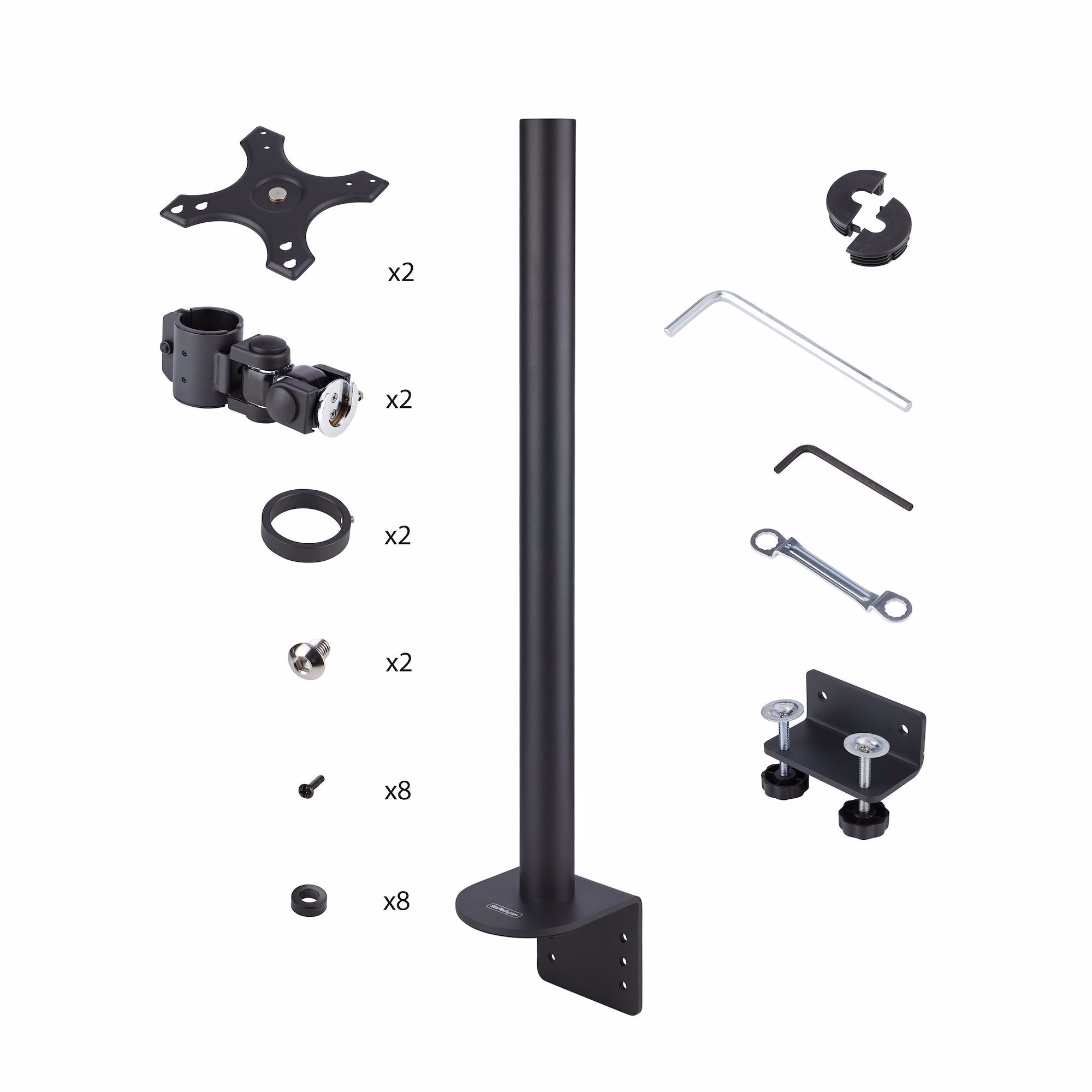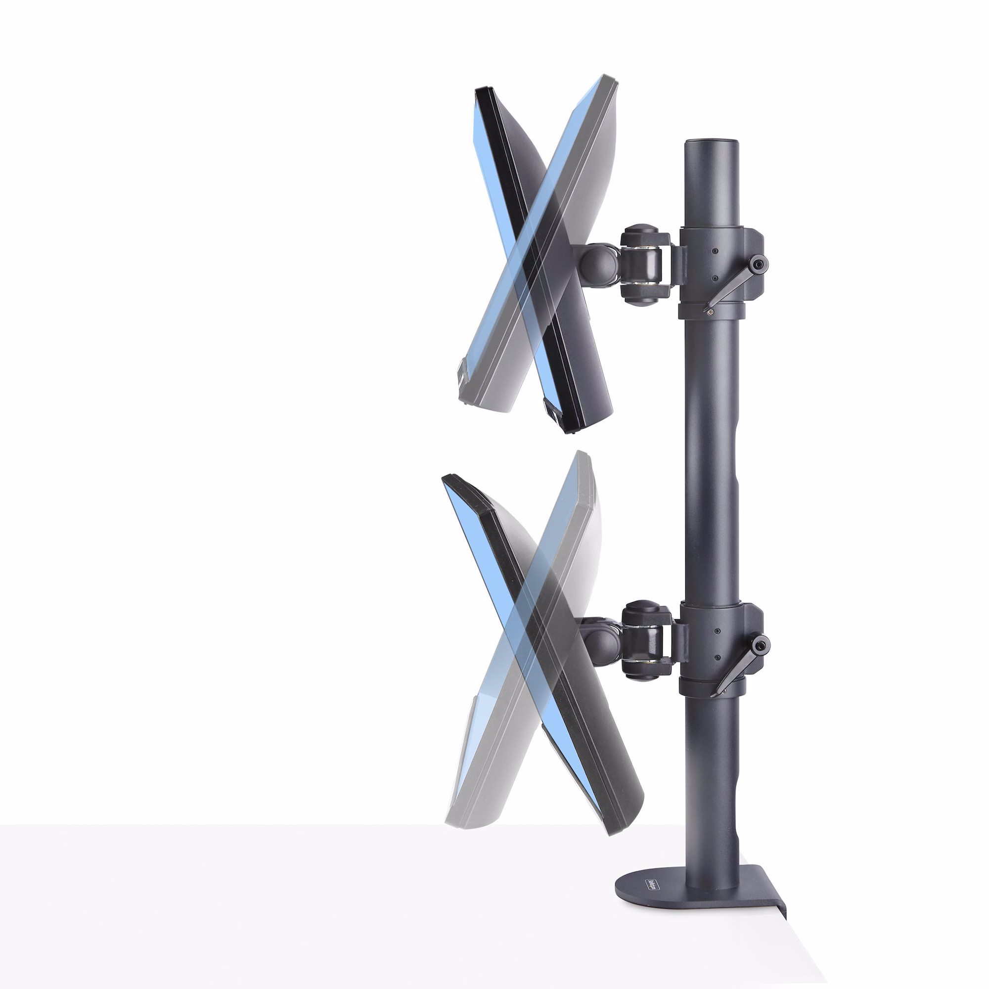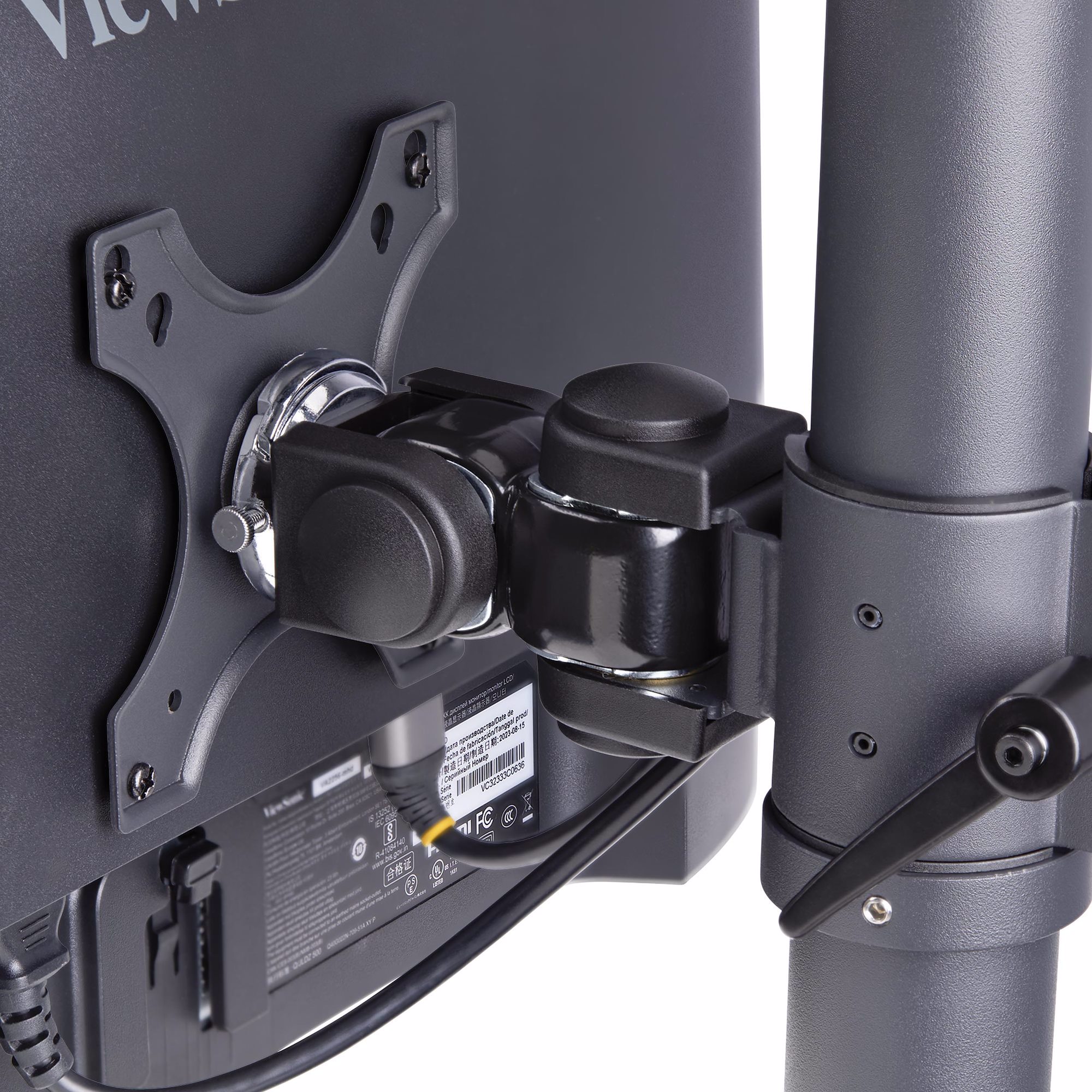 The mount's adjustable design enables height adjustments along the 27.4-inch (69.6cm) pole. Each monitor can be tilted and swiveled up to +/-90° and rotated 360° for seamless switching between portrait and landscape orientations. Additionally, the monitor mounts can be rotated around the pole without requiring tools, offering maximum flexibility.