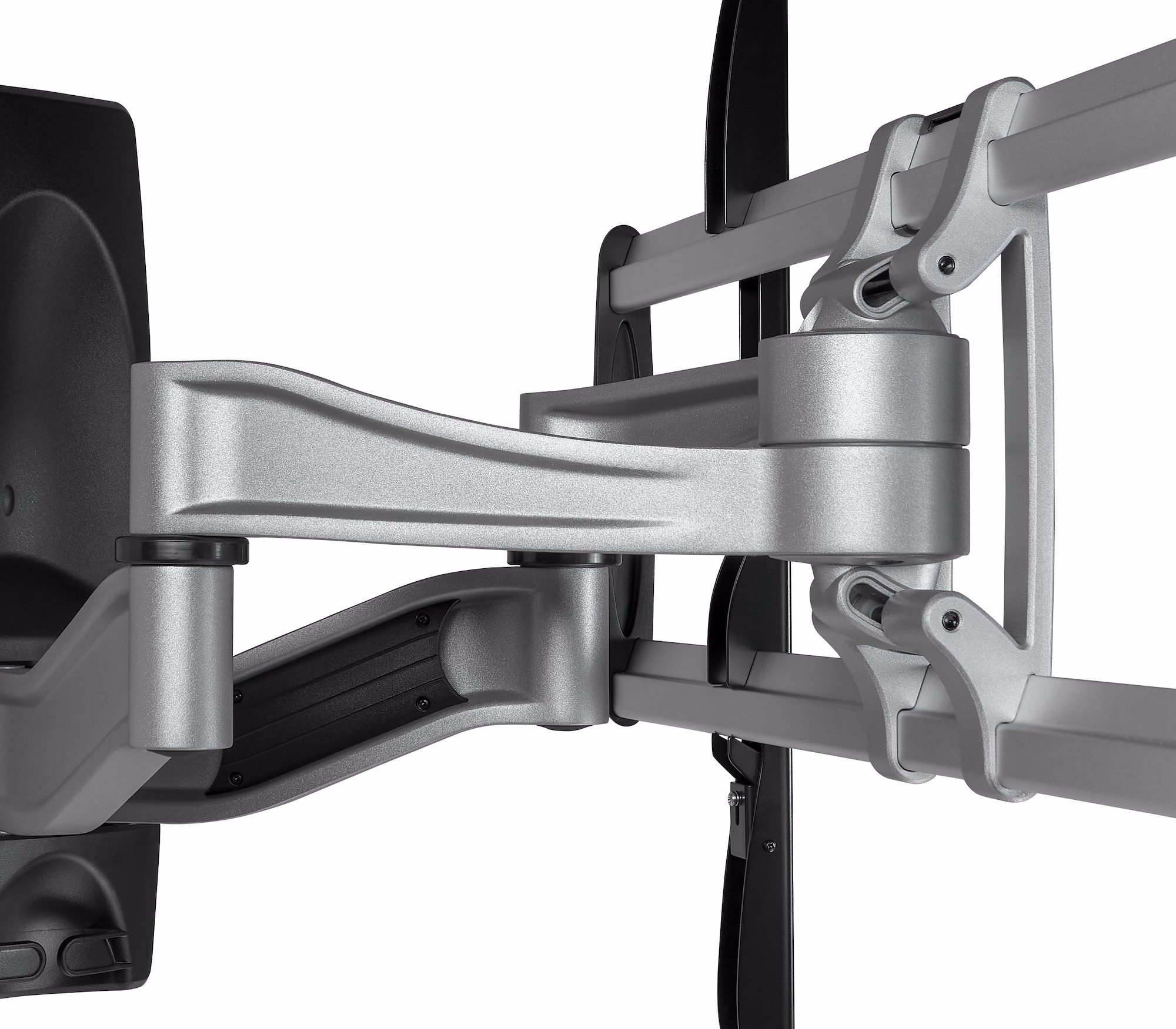 This premium television wall mount beautifully combines form and function. Designed to provide an impressive appearance in every position, the premium black and silver design makes it ideal in a company lobby or hallway, information kiosk, or living space. With the arms extended, the protective covers provide a tidy, professional look. The cable-management channel inside the arms keeps cables neatly tucked away.