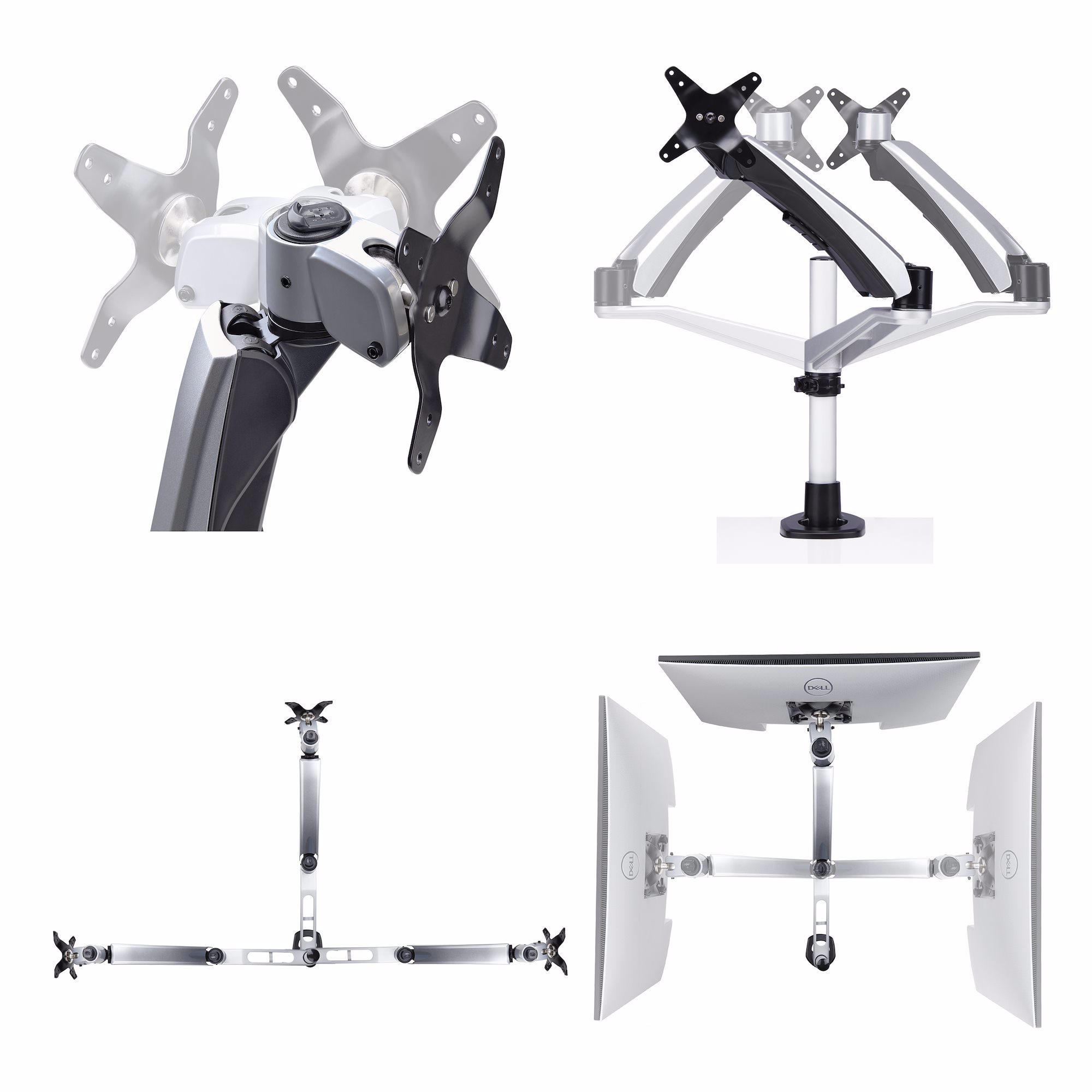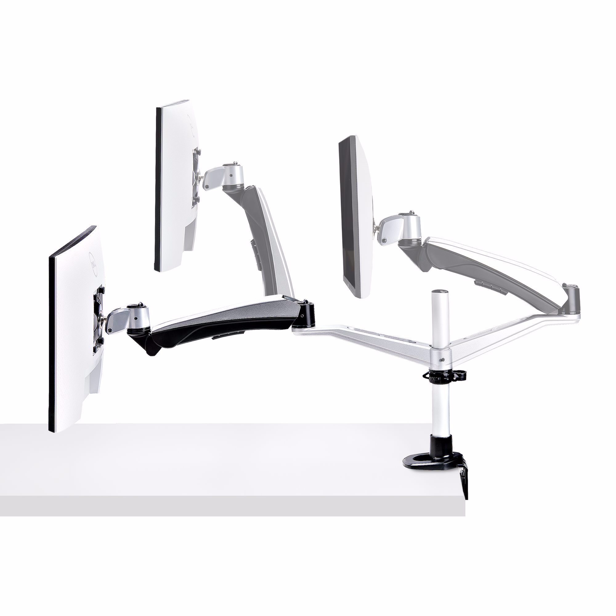 The articulating arm enables toolless adjustments of +/-180° horizontal swivel, 105° tilt, 240° pan, and 360° screen rotation on the VESA plate for portrait or landscape orientations. This flexibility enables users to customize the screen placement for maximum productivity and comfort.