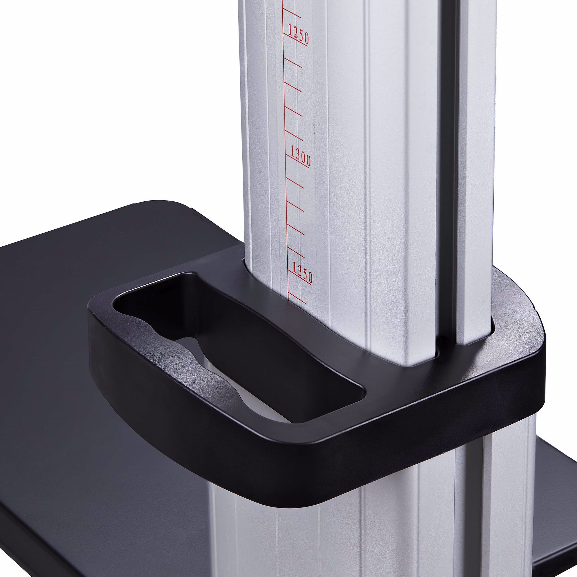 The crank handle allows the user to adjust the height of the TV without tools, from 47.2 to 65 inches (1200-1650mm) helping to accommodate different viewing needs. Height adjustment is possible even when a TV is already mounted, and the height indicators at the back of the column enable precise adjustments. The crank handle can be removed or locked to prevent tampering.