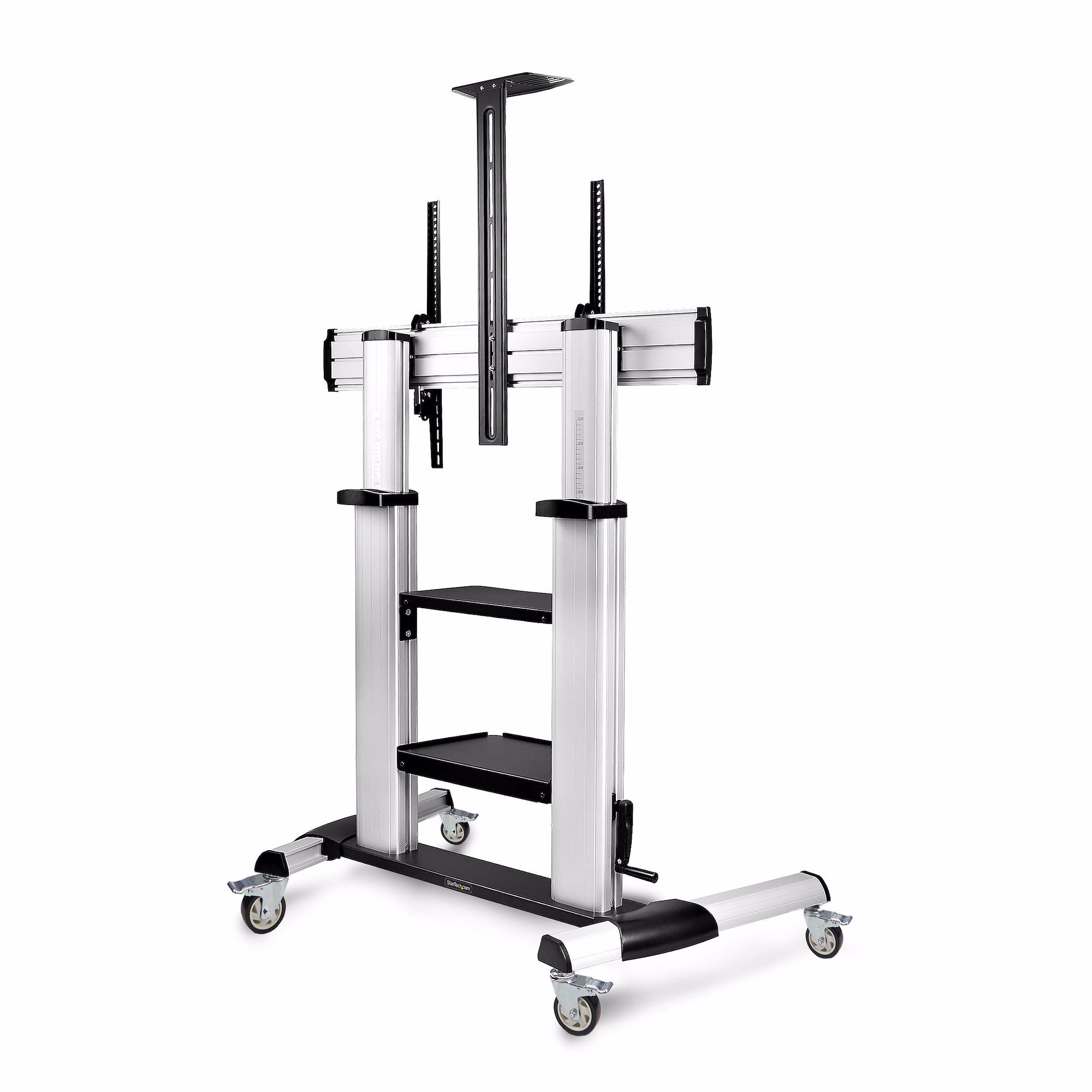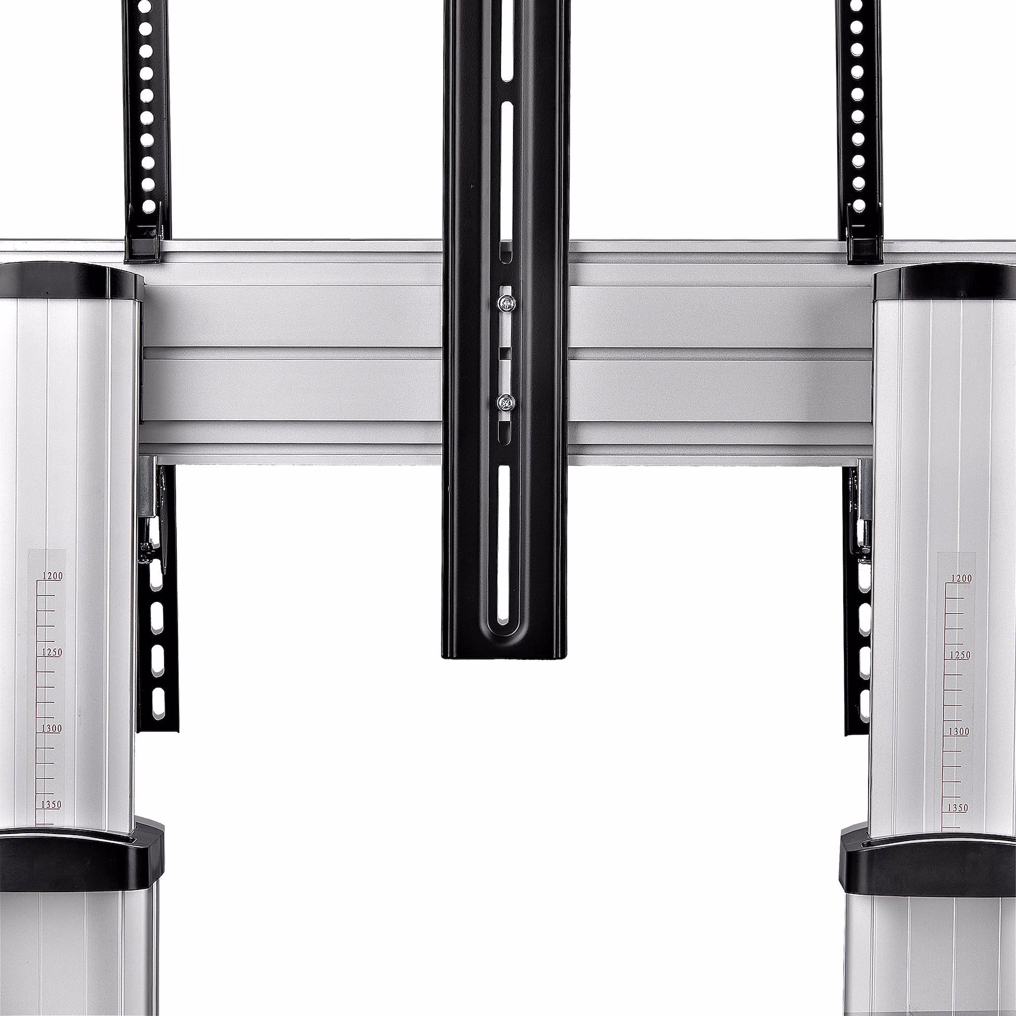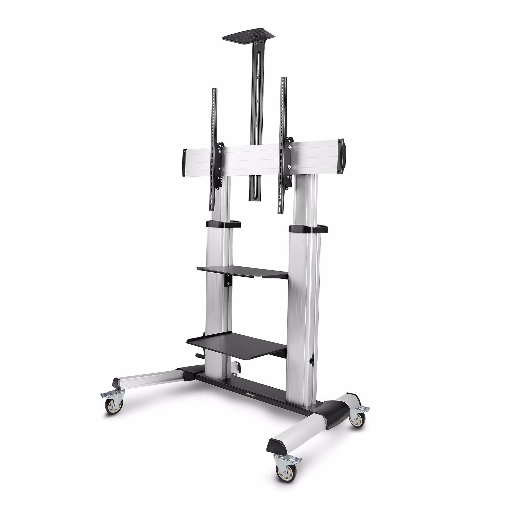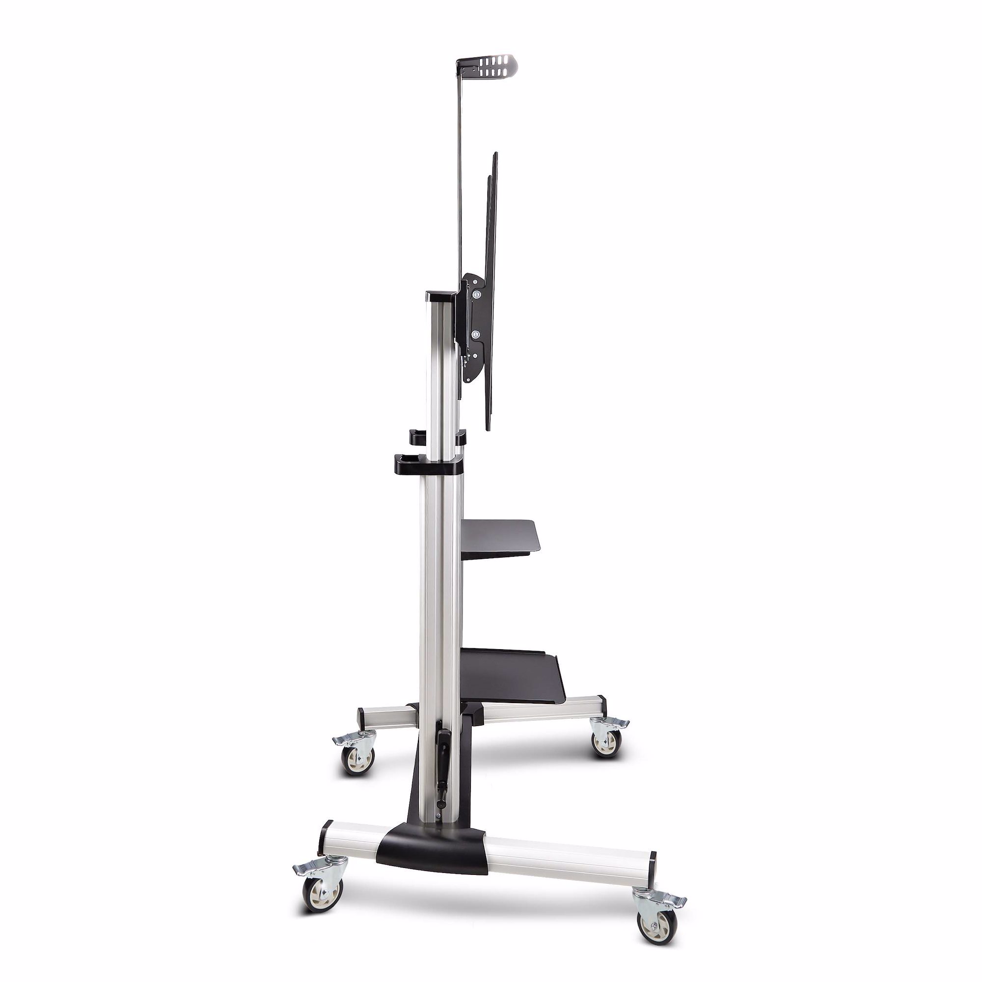 This height-adjustable rolling TV stand creates a mobile media center that can support 60 to 100-inch TVs and 220lb (100kg). Large casters enable users to move the mounted AV equipment with ease across an office, classroom, or trade show hall.