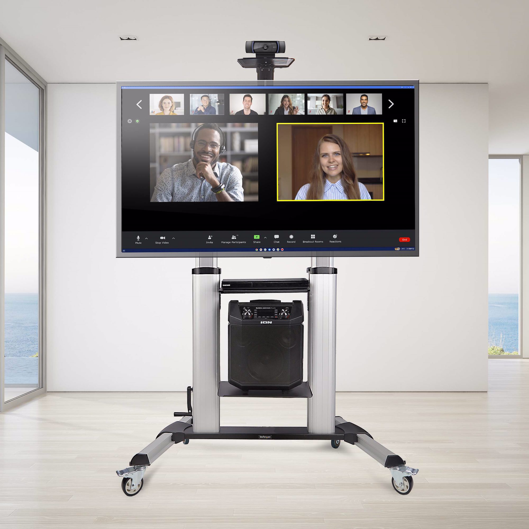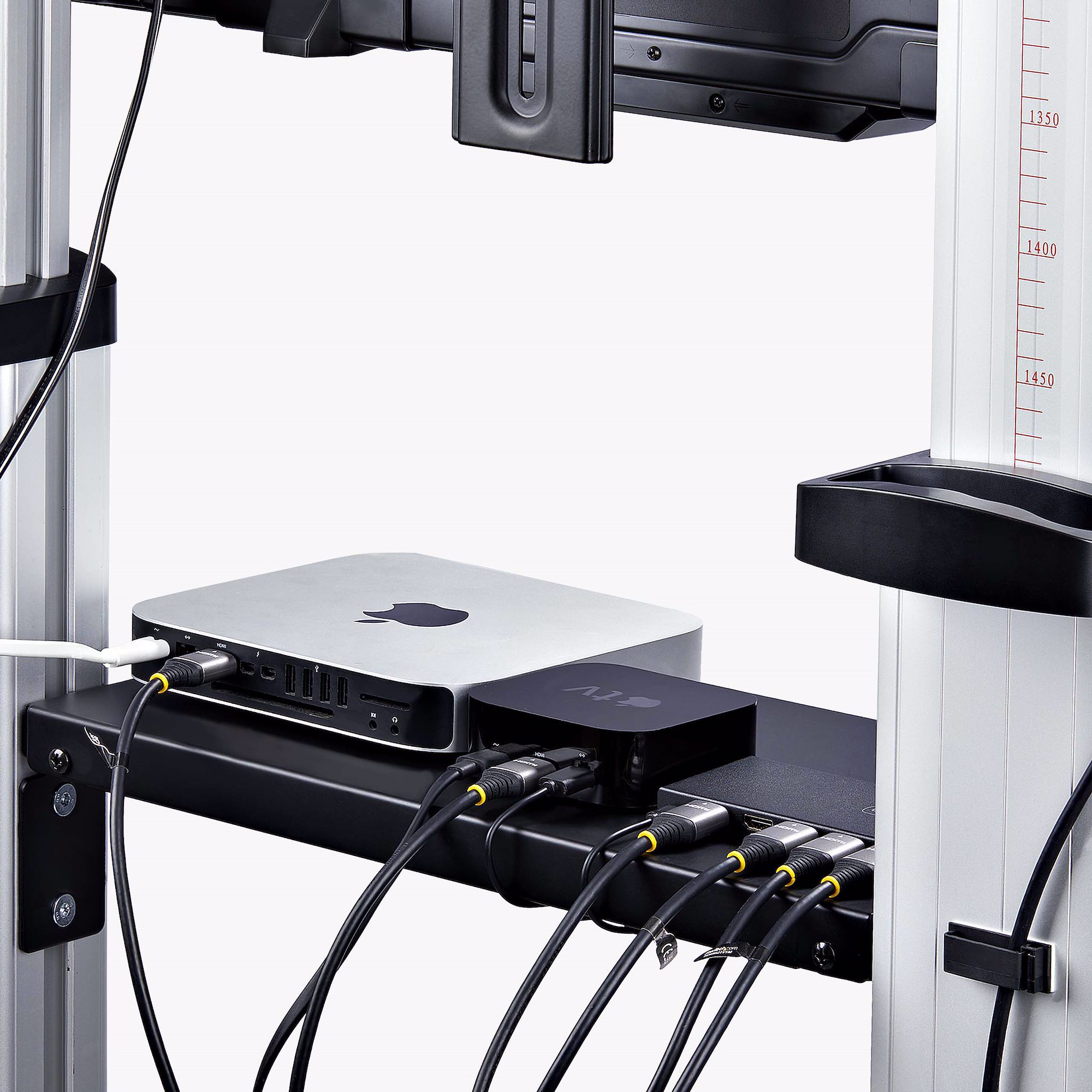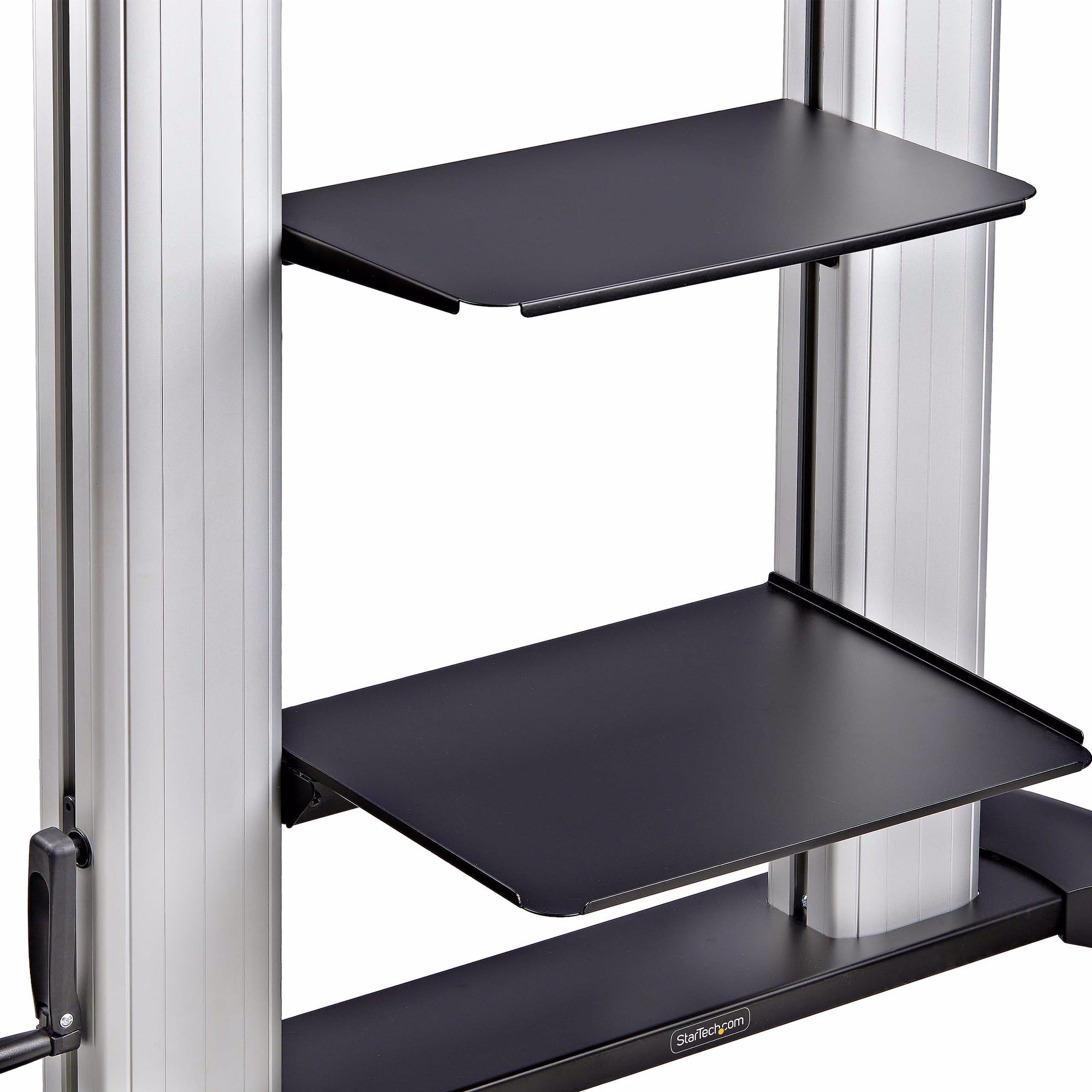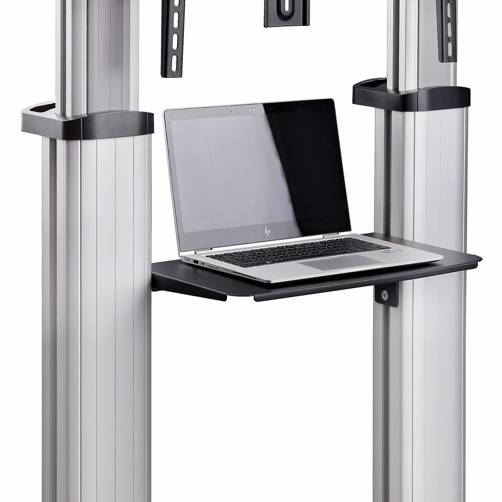For increased portability and customization, this mobile trolley features two independently height-adjustable media shelves under the display that can support up to 11lb (5kg) each. The webcam shelf sitting at the top of the display can be raised up to 93.1" (2366) from the floor.