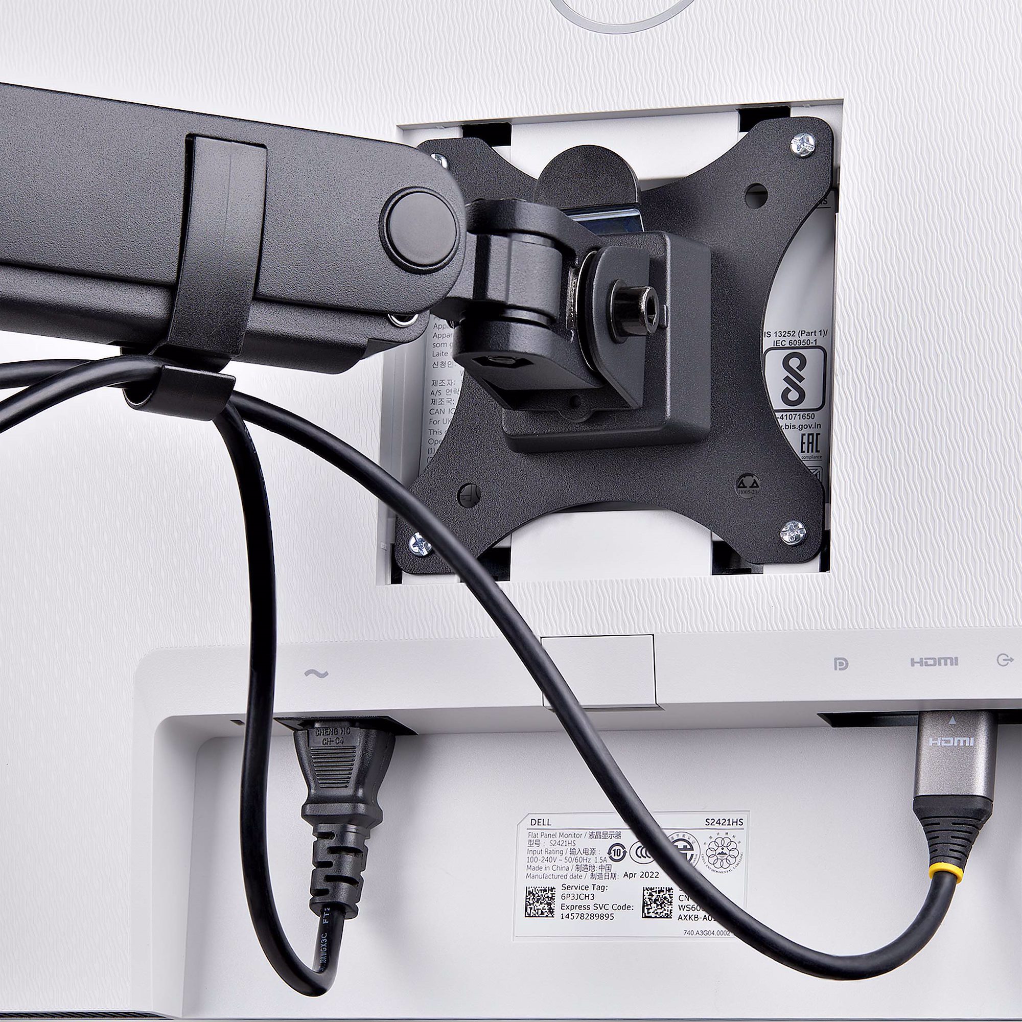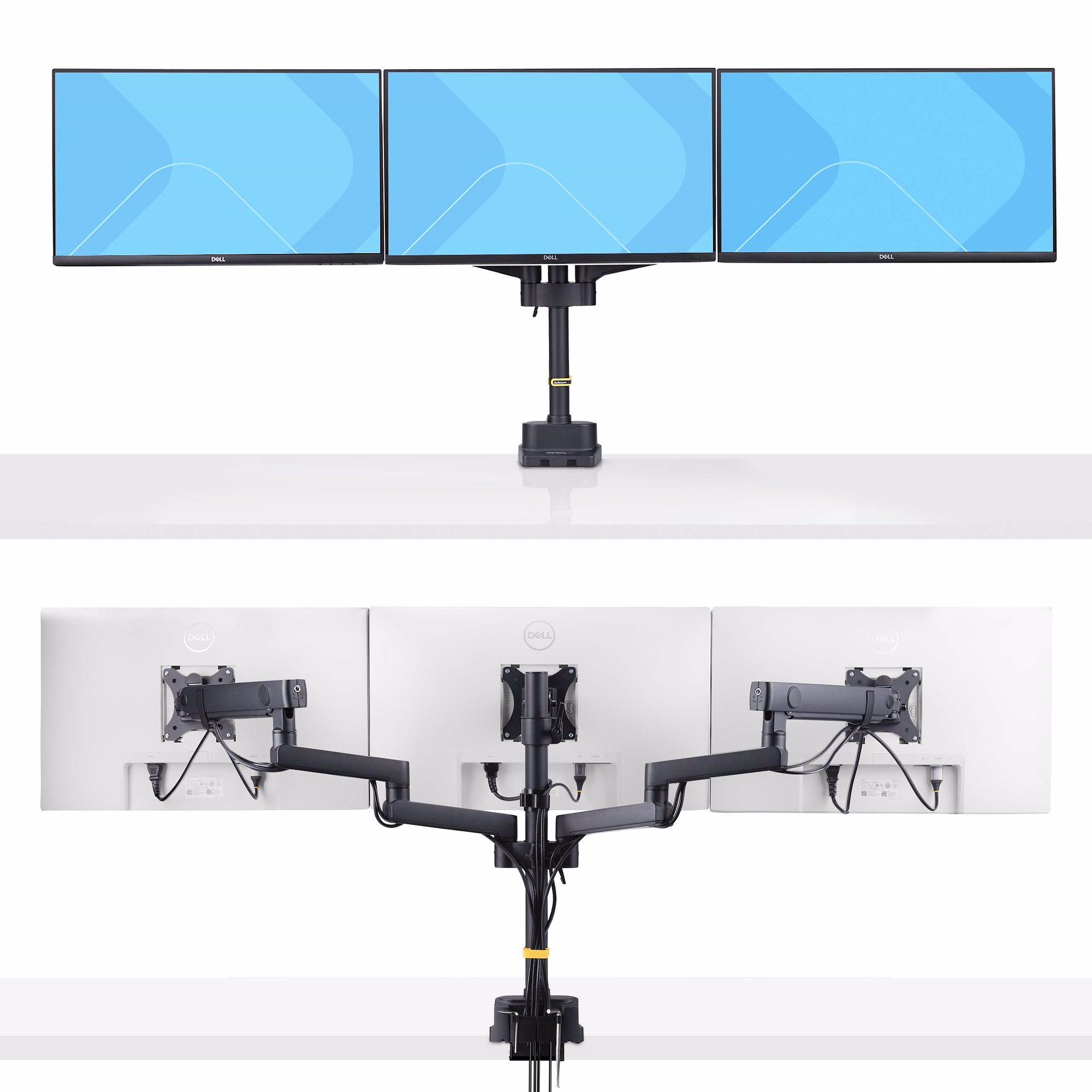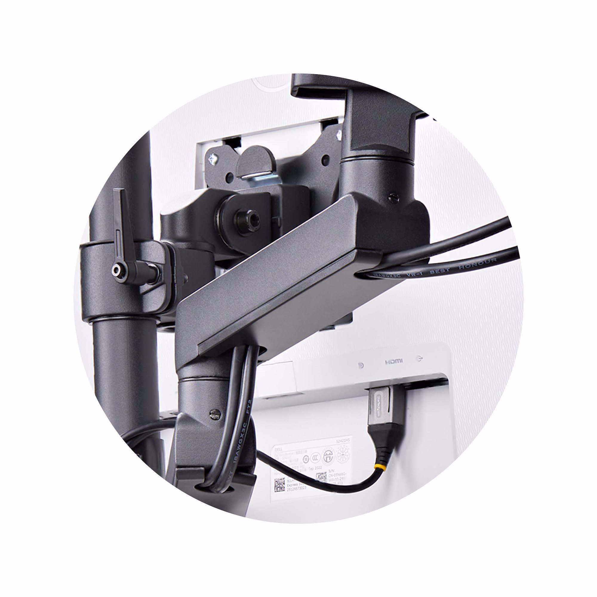 To maintain an organized workspace, the adjustable arms feature cable management channels along the underside to keep cables out of sight, reducing clutter and contributing to a tidy setup. A cable clip on the pole also helps maintain an organized workspace.