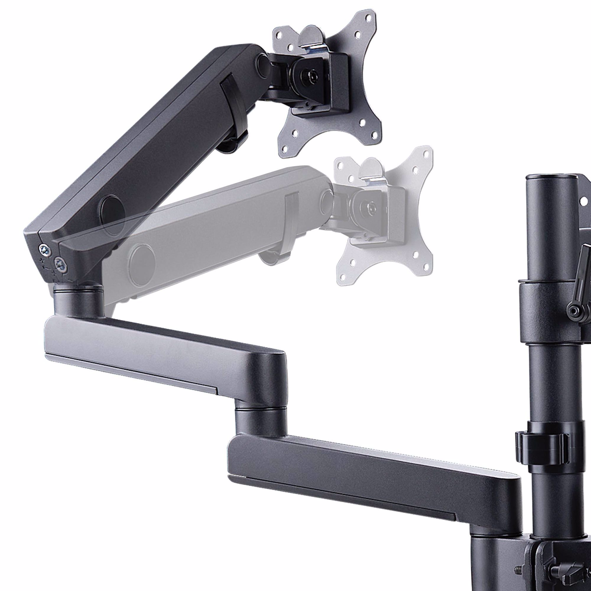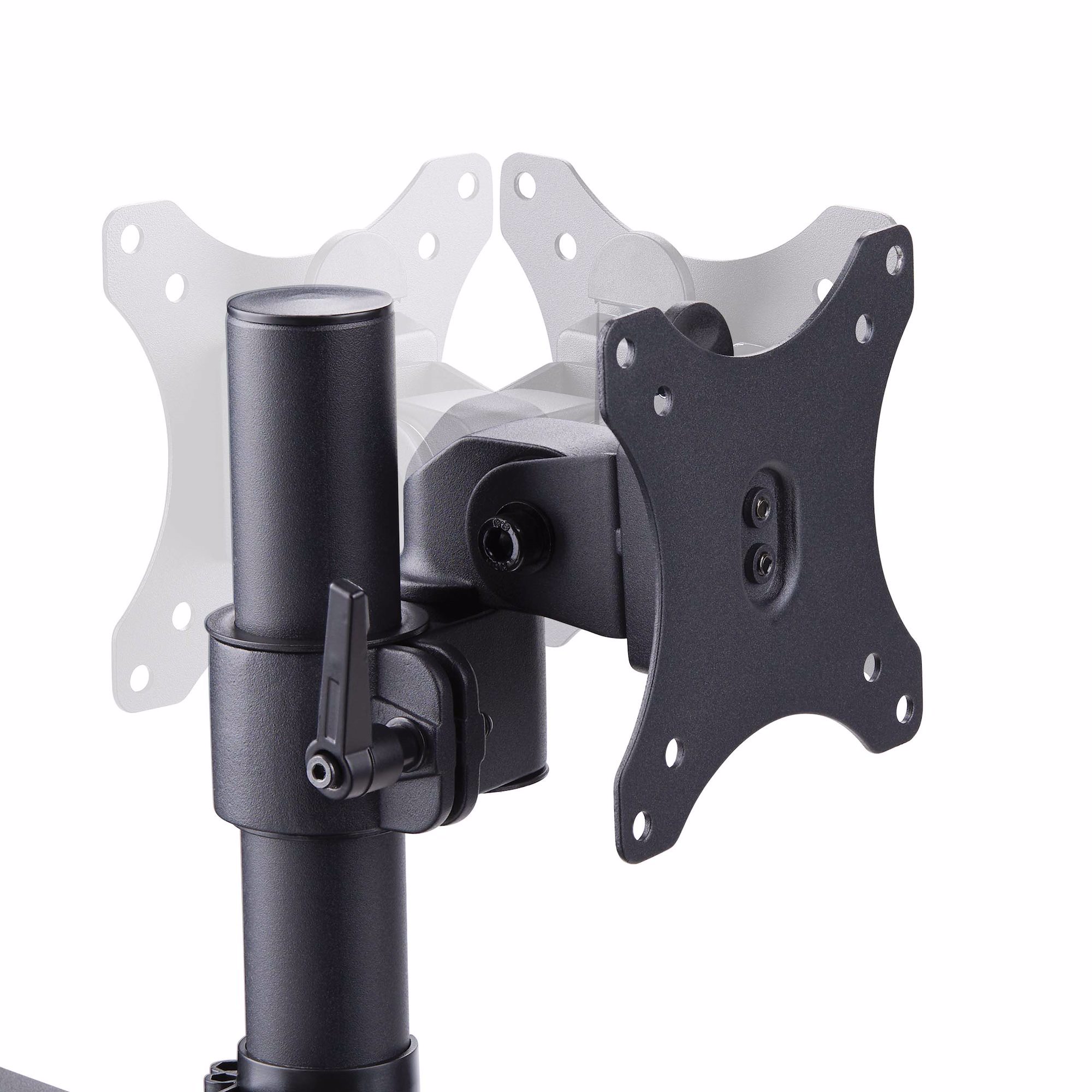 The articulating arms allow toolless adjustments of +/-180° horizontal swivel and +/-90° screen rotation on the VESA plates for portrait or landscape orientations. The VESA mounting plates allow for +/-90° display tilt to provide an ideal viewing angle.