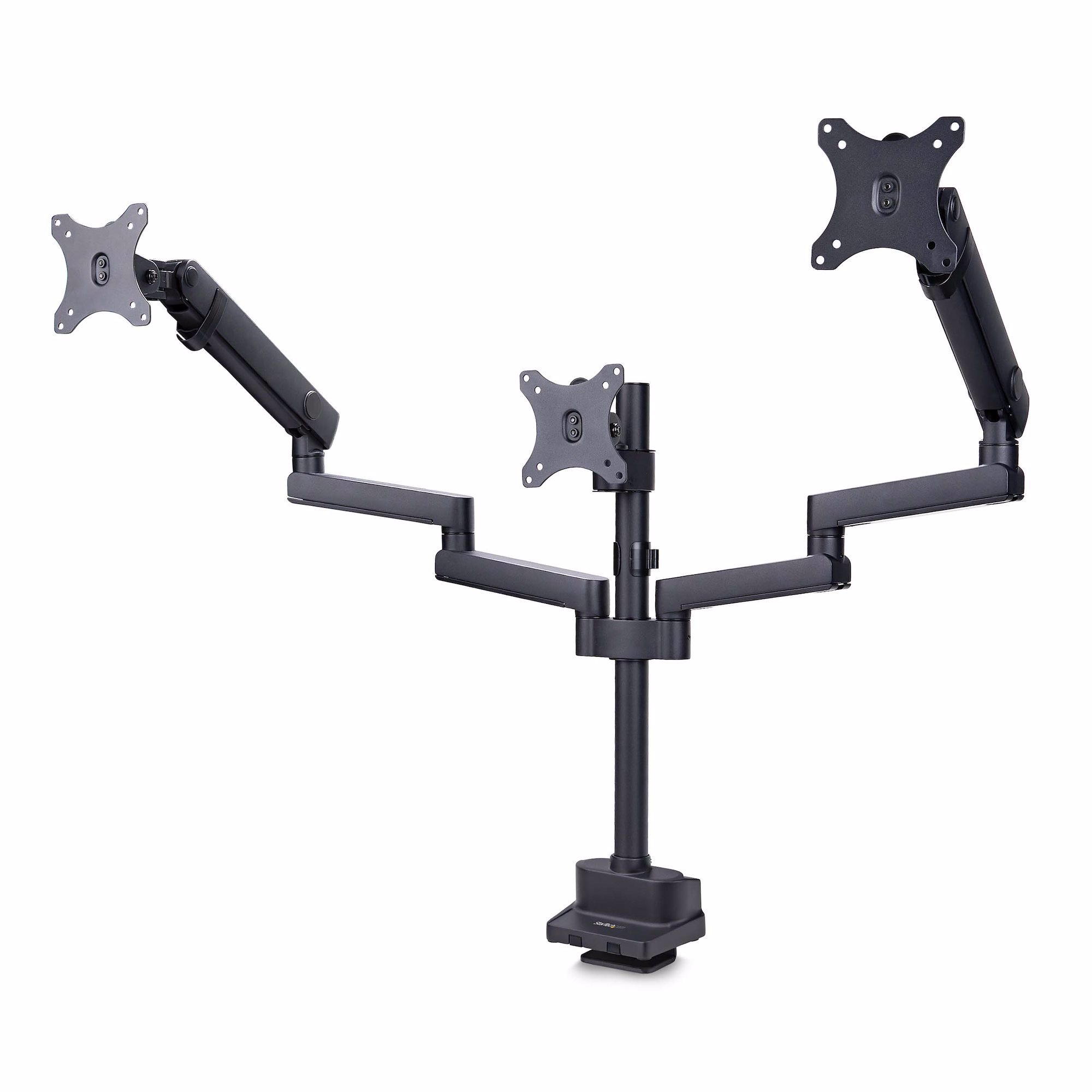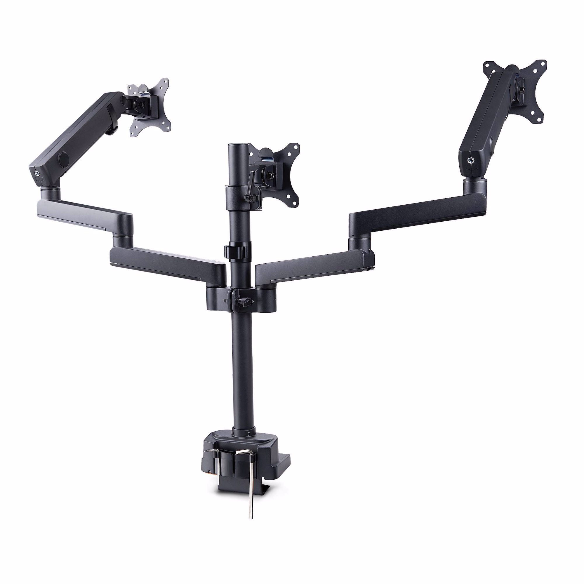 This monitor desk mount is designed to support up to three 27-inch displays, creating an ergonomic multi-monitor setup that provides an extensive viewing area for productivity. The mechanical spring-assisted arms allow multiple adjustment to suit different ergonomic needs.