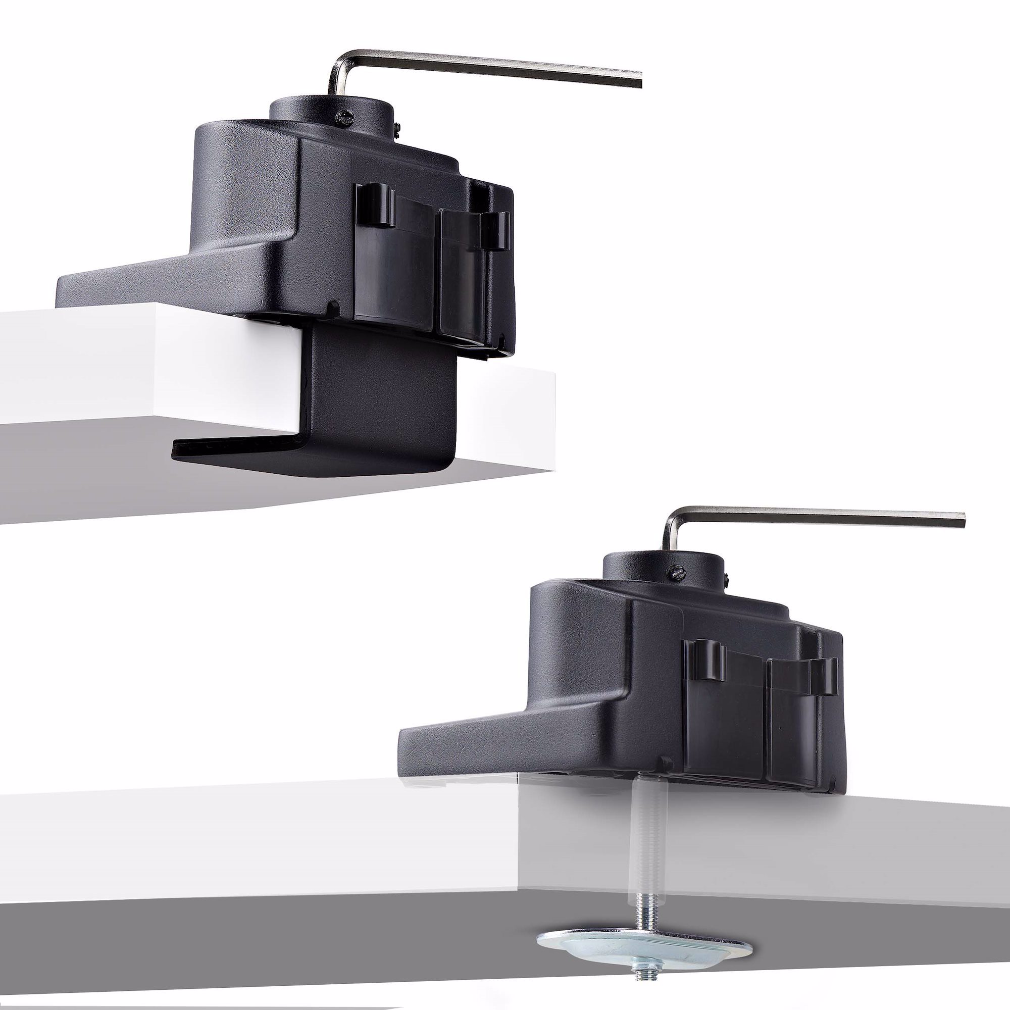 The unique top-screw desk clamp simplifies installation by enabling users to tighten the clamp from manually from above using a hex key or a hand drill, eliminating the need to go under the desk. In addition, the desk clamp is designed with an interchangeable C-clamp and grommet mount to accommodate desks up to 2 inches (50mm) thick, providing flexibility for different desk configurations.