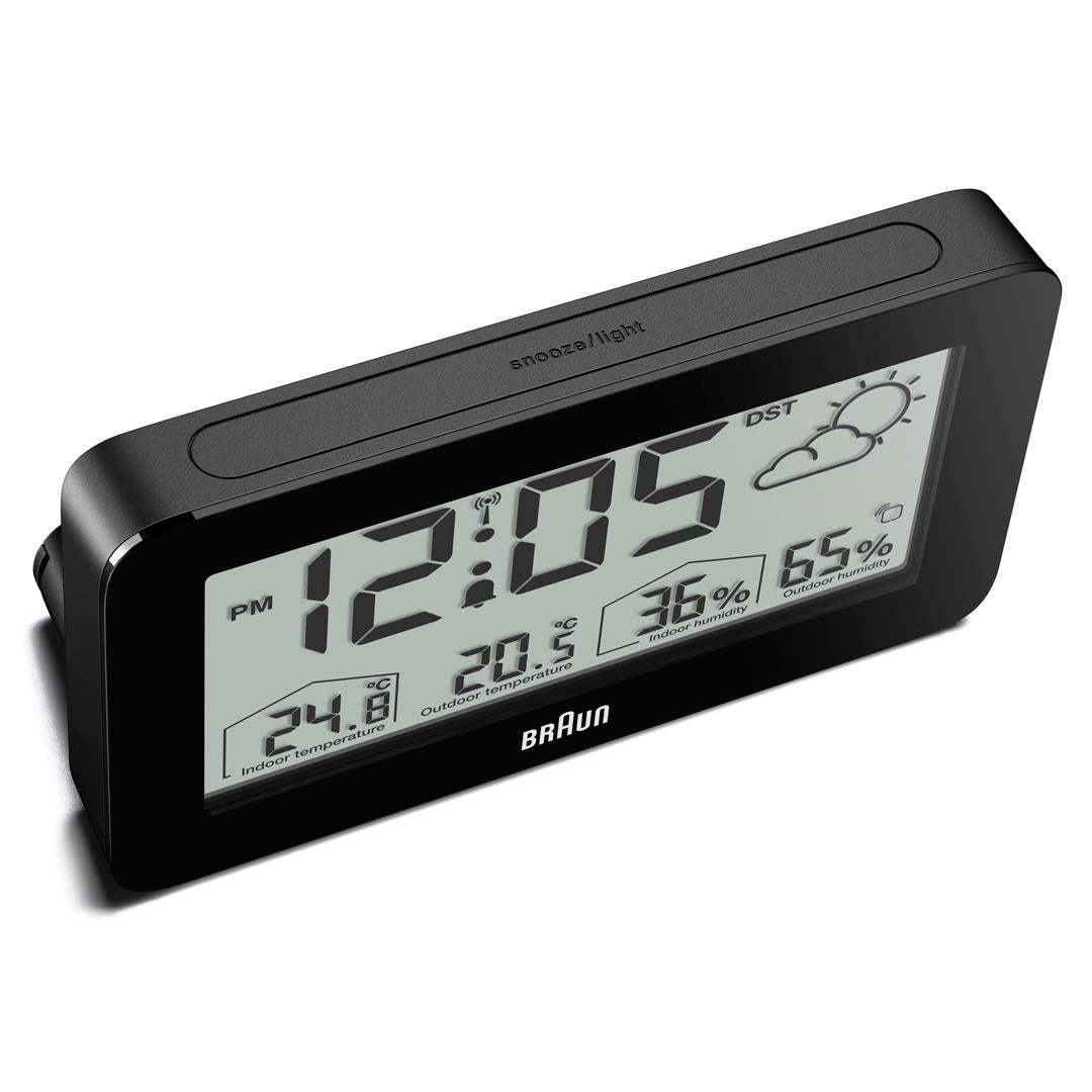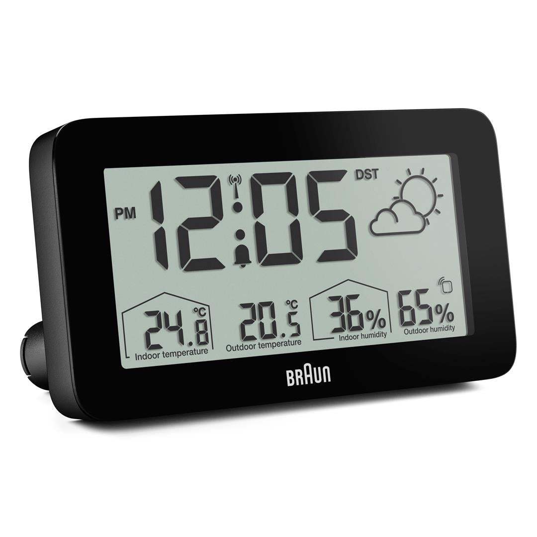 This Braun digital weather station features a positive LCD display with a continuous backlight function that illuminates the display when in a low-light environment to maximise legibility at night. It features a DCF signal Radio Controlled function for Central European Time Zone, ensuring ultimate accuracy at all times. The BC13-DCF can be set to either 12 or 24 hour mode, and displays the time, The BC13-DCF has a customisable interface that can display indoor and outdoor temperature (°C or °F) and indoor and outdoor humidity. The outdoor sensor also features a temperature display.