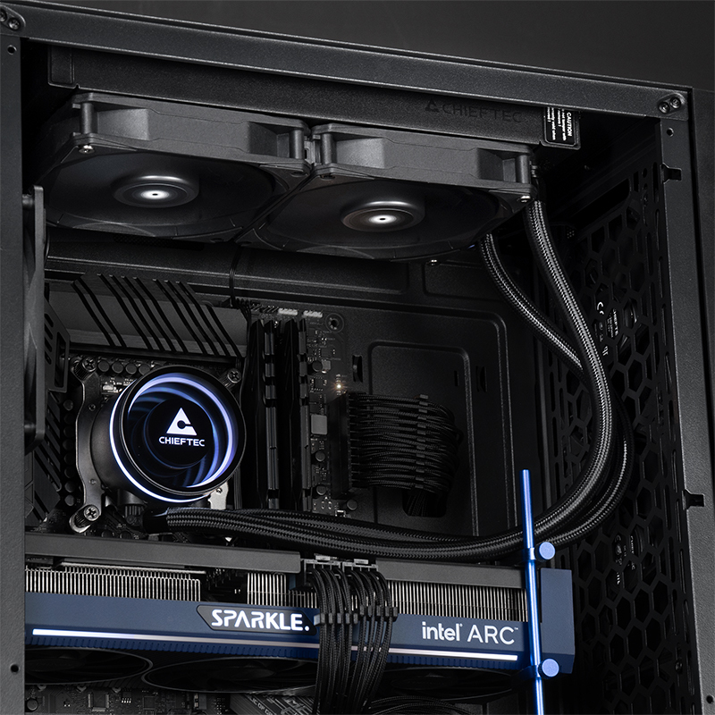 The CHIEFTEC ICEBERG is an All-In-One CPU cooler, featuring a 240mm water-cooling radiator and Snap-On interlocking PWM fans that ensure excellent heat dissipation. With fan speeds reaching up to 2200 rpm, it provides efficient cooling for a wide range of CPUs. The innovative parallel fin radiator design maximizes the contact area between water tubes and radiator fins, while maintaining a high surface area exposed to the cooling airflow, thereby enhancing overall thermal transfer and heat dissipation. The ICEBERG includes an infinity mirror ARGB cooling block and a 360-degree rotatable CHIEFTEC logo. Installation is hassle-free thanks to the robust braided steel tubing and the convenient mounting clip kit. The snap-on interlocking PWM fans minimize the number of cables ensuring an easy and clean build. The ICEBERG is your trusted, reliable choice for pushing your CPU to maximum performance, while ensuring optimal thermals and noise levels.