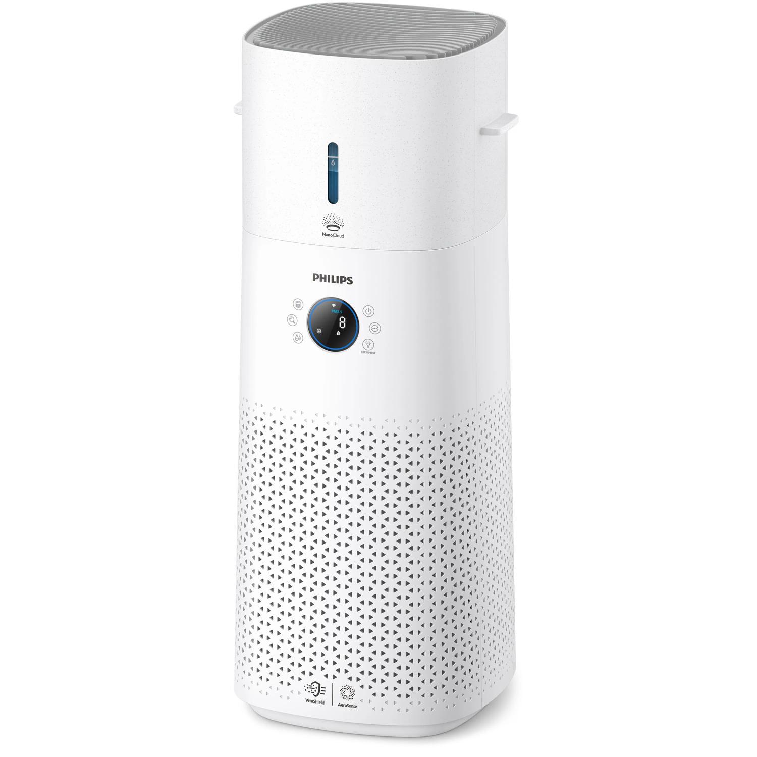 Philips 2-i-1 luftrenser og -fugter: Effektiv og brugervenlig. Fungerer som luftfugter og luftrenser eller kun luftrenser med aftagelig vandtank. Renser grundigt store rum og eliminerer 99,97 % forurenende stoffer og 99,9 % formaldehyd.