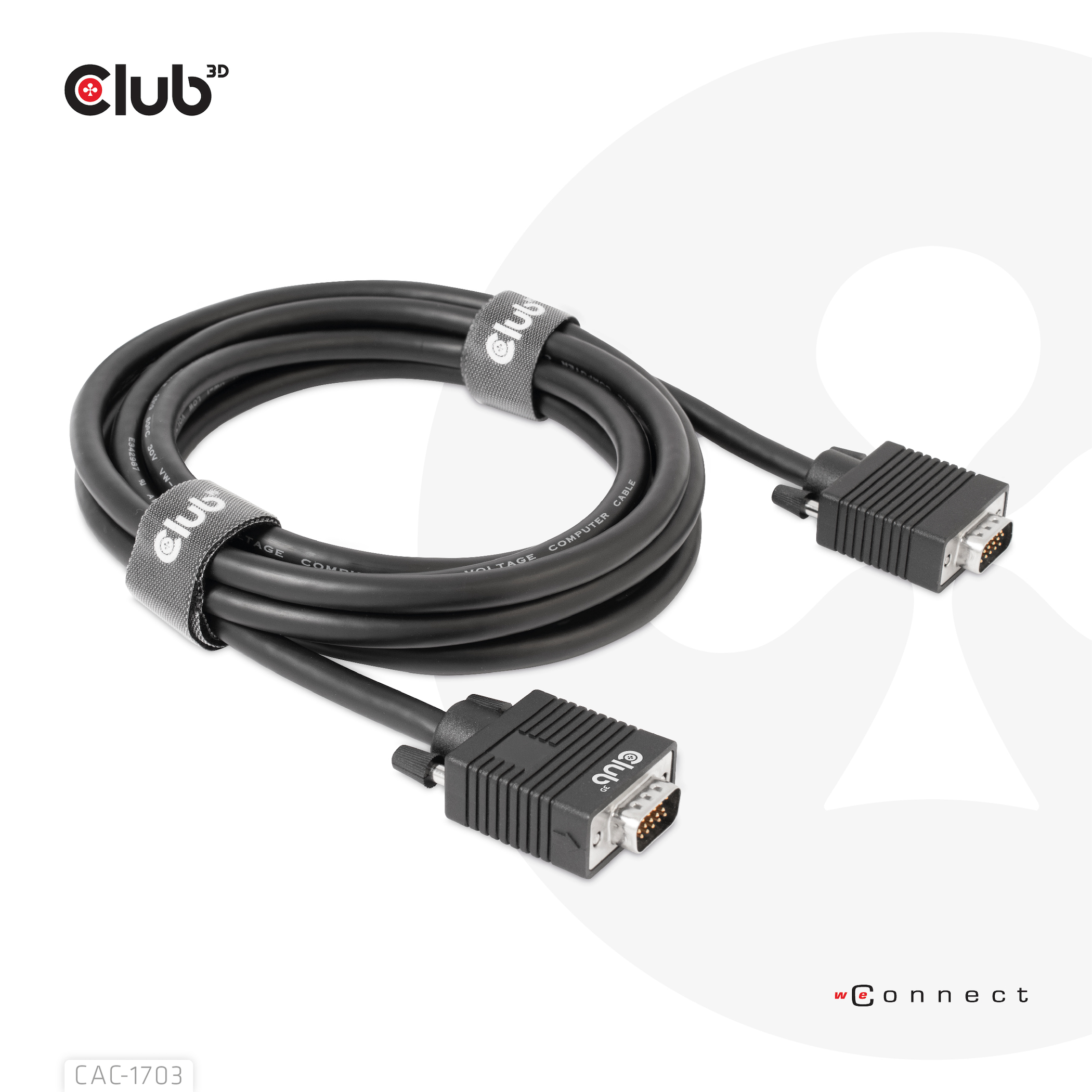The Club 3D CAC-1703 VGA Cable Bidirectional M/M 3m/9.84ft 28AWG links any VGA-equipped desktop, laptop or adapter to a monitor, display, beamer or projector with a 15-pin VGA Female port. Ideal for at home or work, the cable creates a reliable connection for anything from gaming to video projection and supports up to Full HD 1080p (max. resolution of 1920 x 1080). This quality VGA cable provides superior performance thanks to the combined effect of its Gold plated connectors and 28 AWG conductors. Internal shielding provides reduced crosstalk, suppresses noise, and helps prevent electromagnetic interference (EMI) and radio frequency interference (RFI). Experience a reliable, high-quality connection with this convenient VGA to VGA 3m / 9.84ft cable.