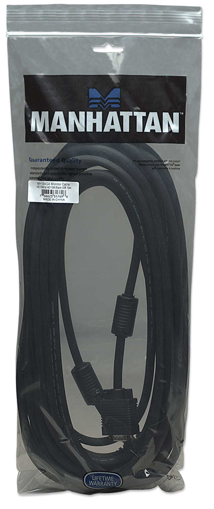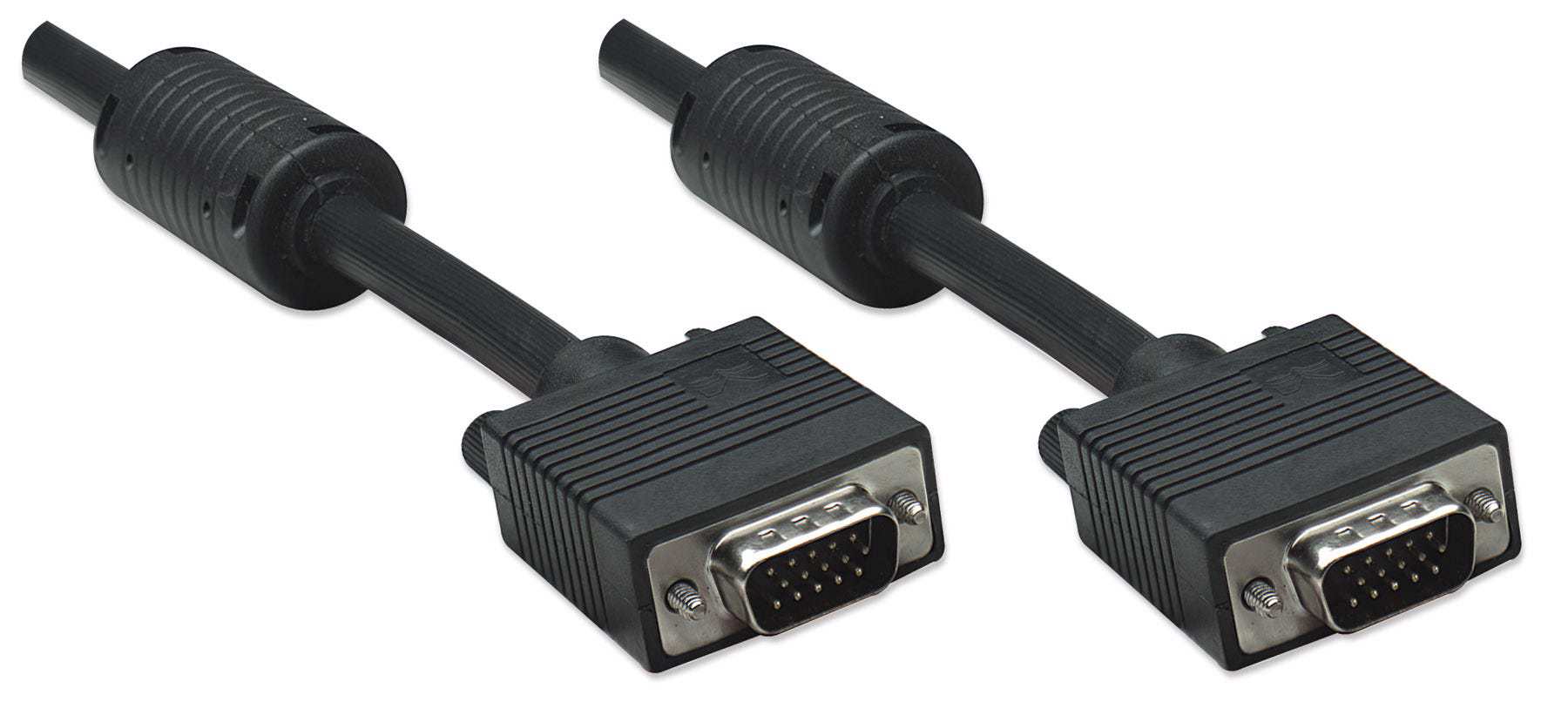 Manhattan SVGA Cables easily connect a monitor with a desktop or notebook computer. Ideal for use with video splitters, KVM switches and any HD15-equipped display, computer or device, Manhattan SVGA Cables are engineered and constructed of quality materials to deliver dependable transmissions in video applications. Full foil and braided shielding with ferrite cores help minimize EMI interference and mini-coax (RGB) with paired video wire construction combine to provide maximum conductivity and clear, crisp images with reduced distortion over extended distances.