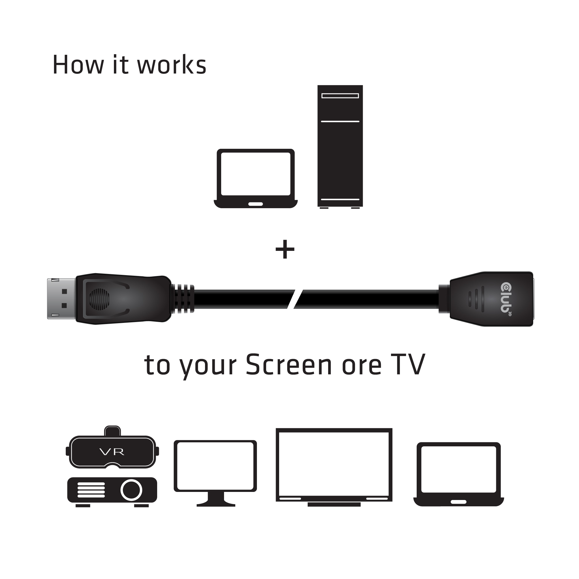 CAC-1022 - The Club 3D DisplayPort™ 1.4 HBR3 Male/Female, 2m/6.56ft. Cable enables the extension of your connection to your DisplayPort™ supported (Gaming) PC or Laptop to an (Ultra) High Resolution Monitor or other DisplayPort™ supported device. DisplayPort™ 1.4 adds support for Display Stream Compression 1.2 (DSC), Forward Error Correction, and extends the maximum number of inline audio channels to 32.