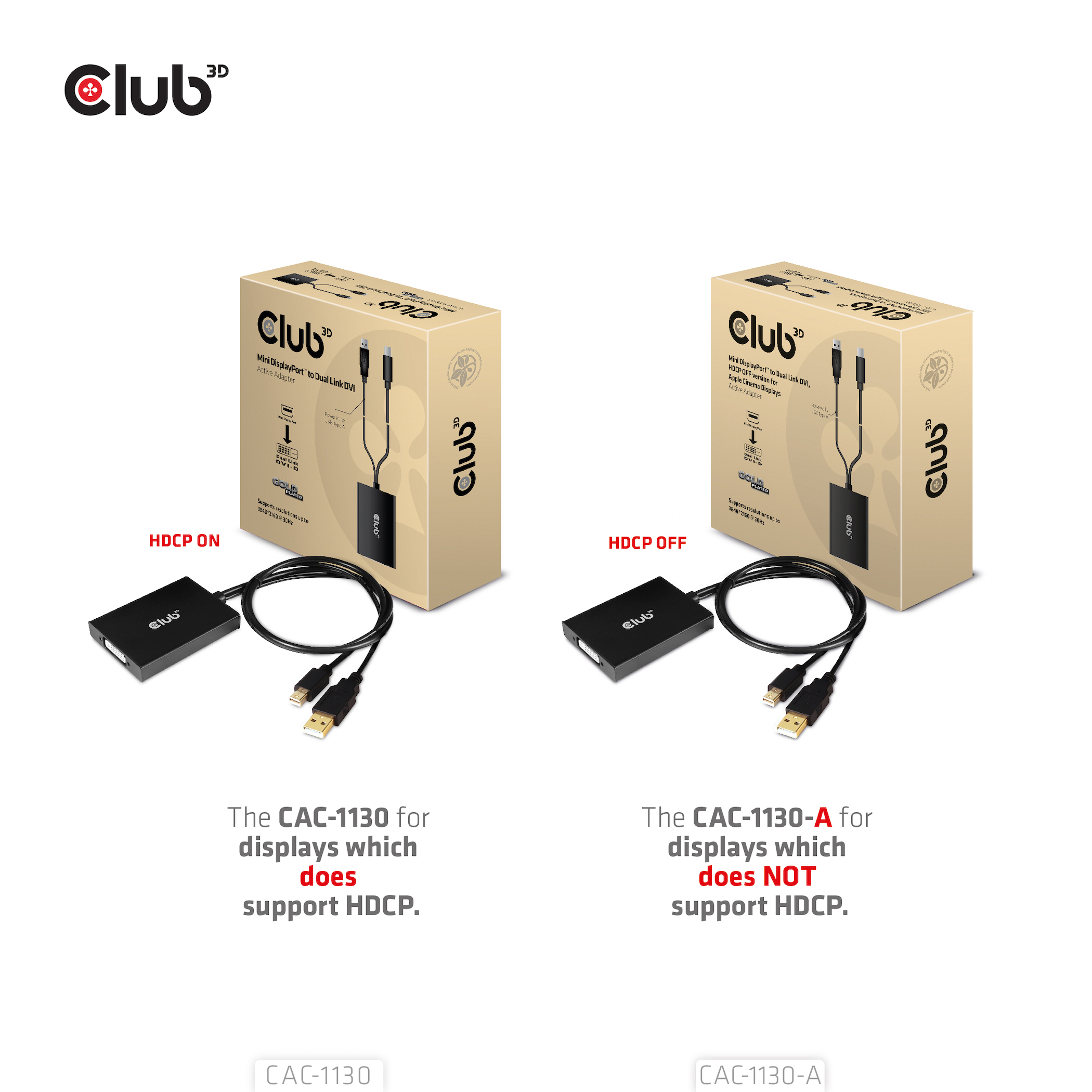 The CAC-1130-A Mini DisplayPort™ + USB Type-A (for Power) to Dual Link DVI signal format converter, HDCP OFF version for Apple Cinema Displays or other displays which do not support HDCP. Seamlessly connect Mini DisplayPort™ based source to conventional DVI displays, such as CRT, LCD monitors and projectors. You can enjoy the ultimate widescreen canvas with a resolution of 2560 x 1440 @ 60Hz and up to 3840 x 2160 @ 30Hz on any other HDCP OFF capable display, like the Apple Cinema Display.