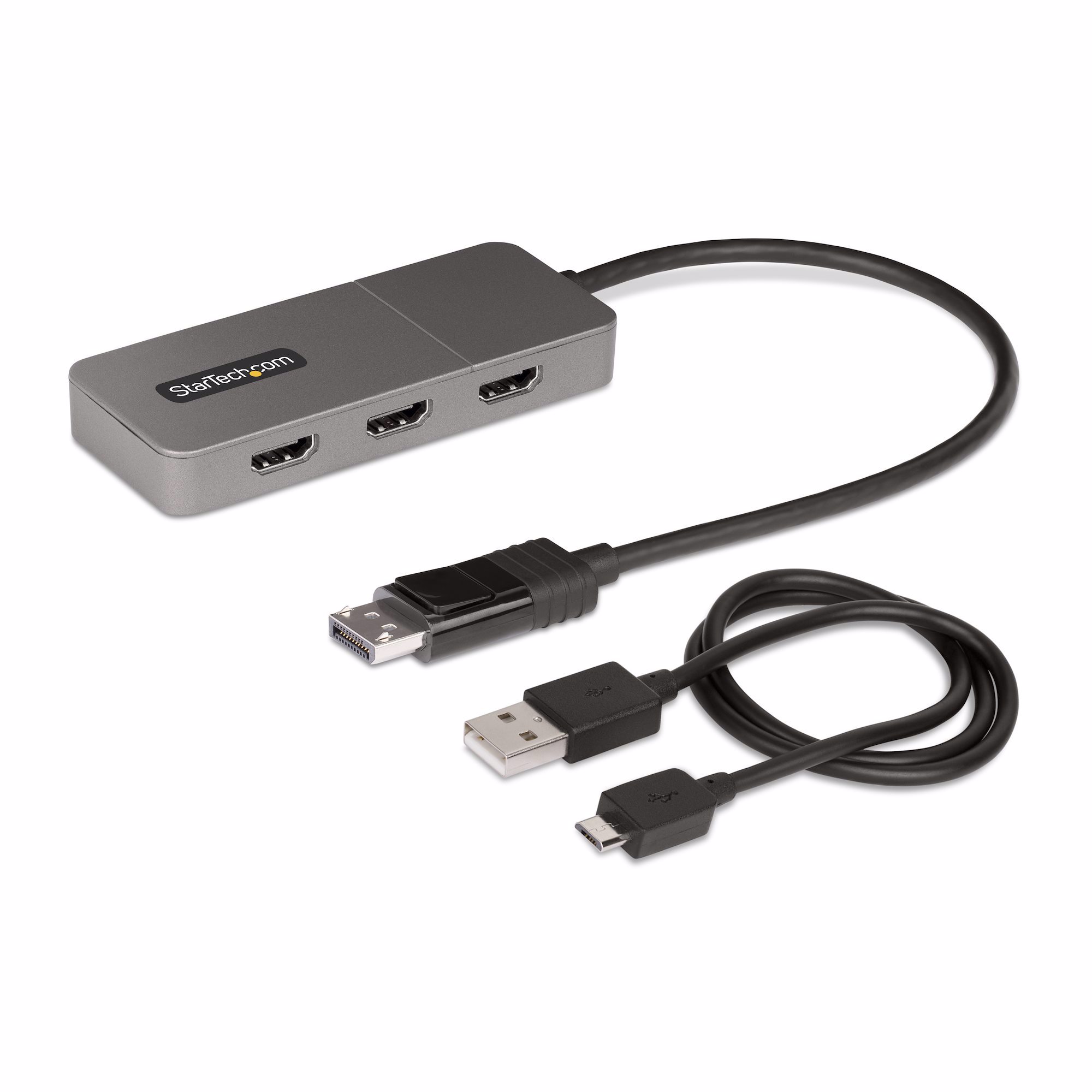 Connect three HDMI monitors to a DisplayPort-enabled host device, using this DisplayPort to HDMI MST Hub.