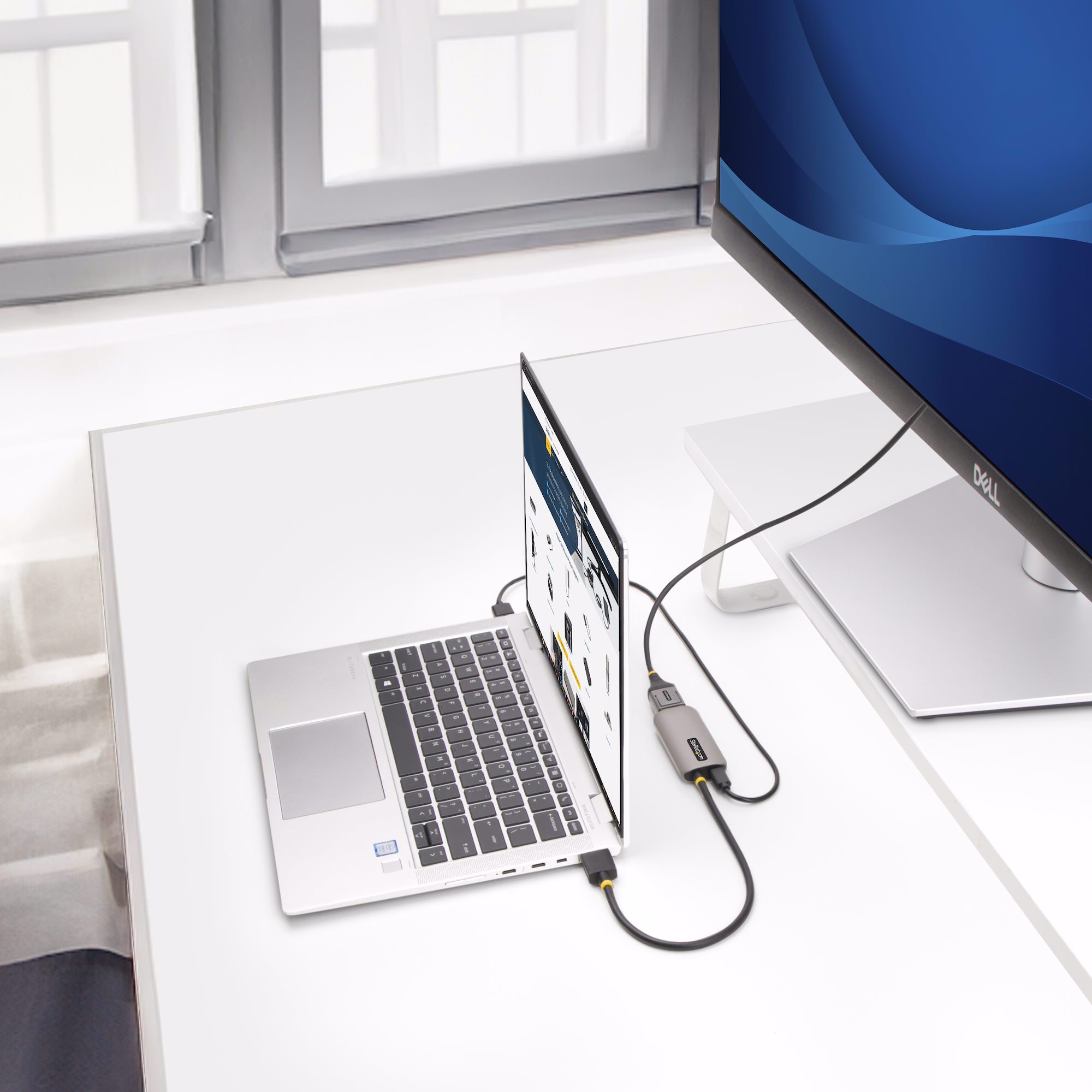 This universal active adapter utilizes integrated or dedicated GPUs, enabling high-performance video with minimal CPU usage. It requires no drivers or software and works with any HDMI-enabled laptop, desktop, Ultrabook, MacBook, or Chromebook. It is compatible with any operating system, including Windows, macOS, Ubuntu, and ChromeOS.